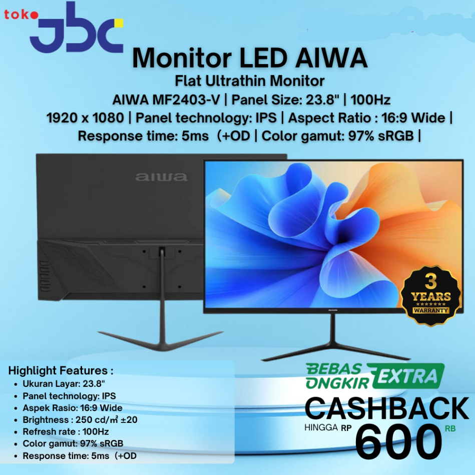 Monitor LED AIWA MF2403-V 24" IPS 1080p FHD 100Hz VGA HDMI Flat Slim Design resmi 3 tahun