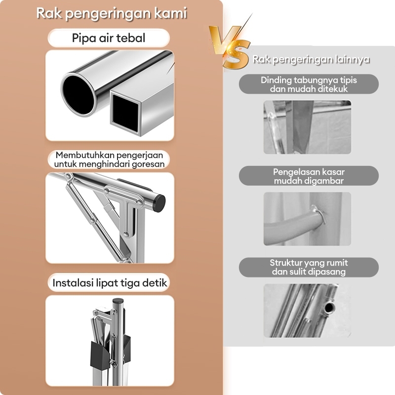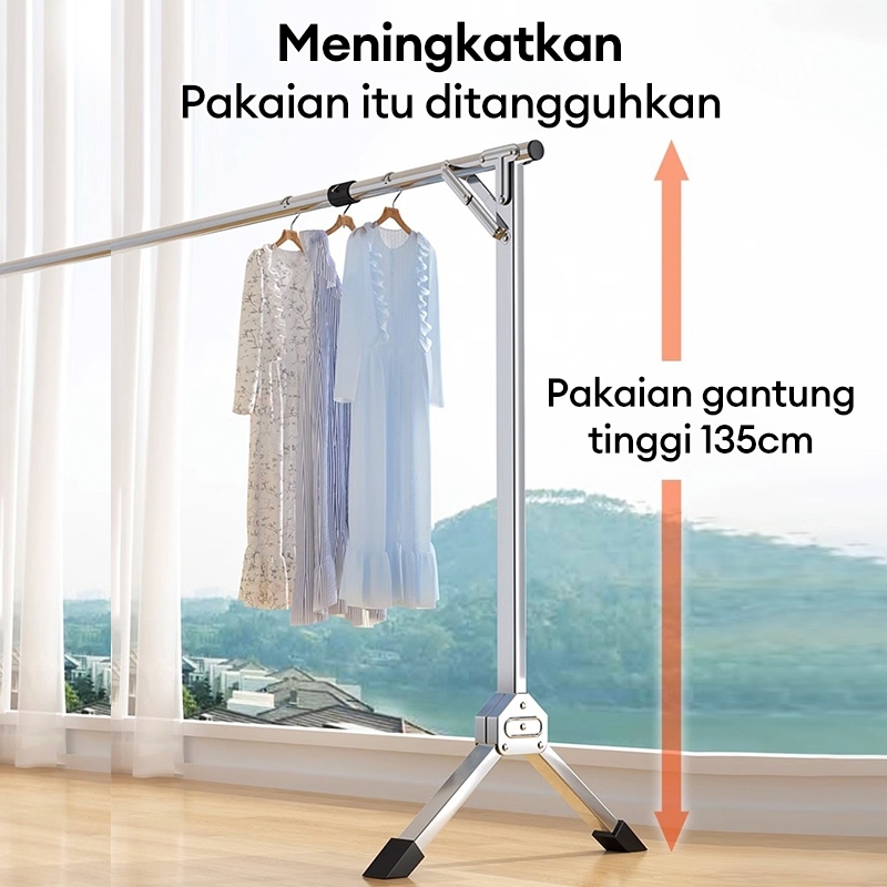 Jemuran Baju Lipat Anti Karat Single 304 Panjang Telescoping 160/200/240CM Dapat Dengan Roda