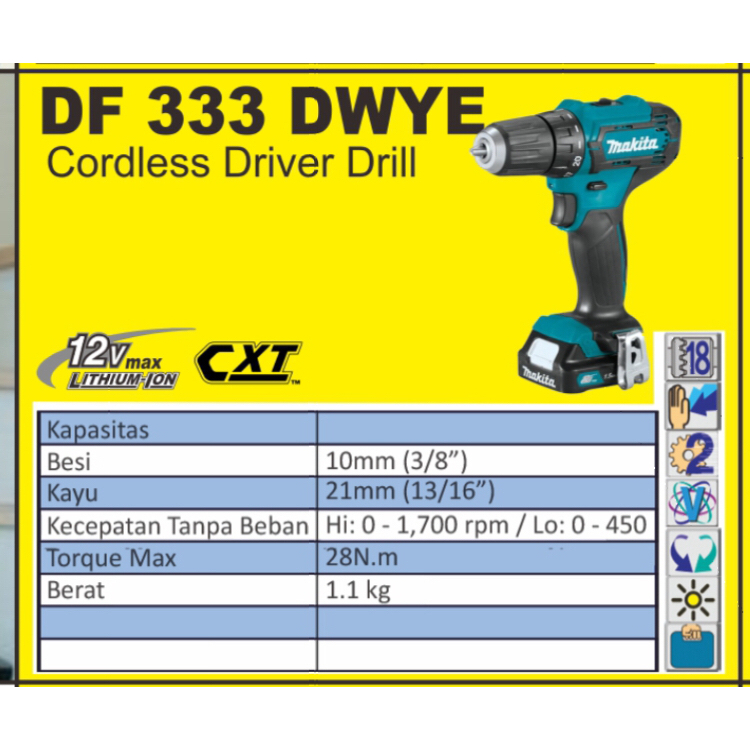 Makita Mesin Bor Baterai DF333DWYE - Cordless Drill DF 333 DWYE
