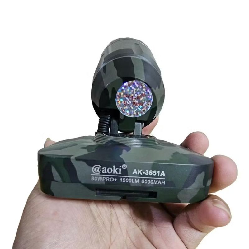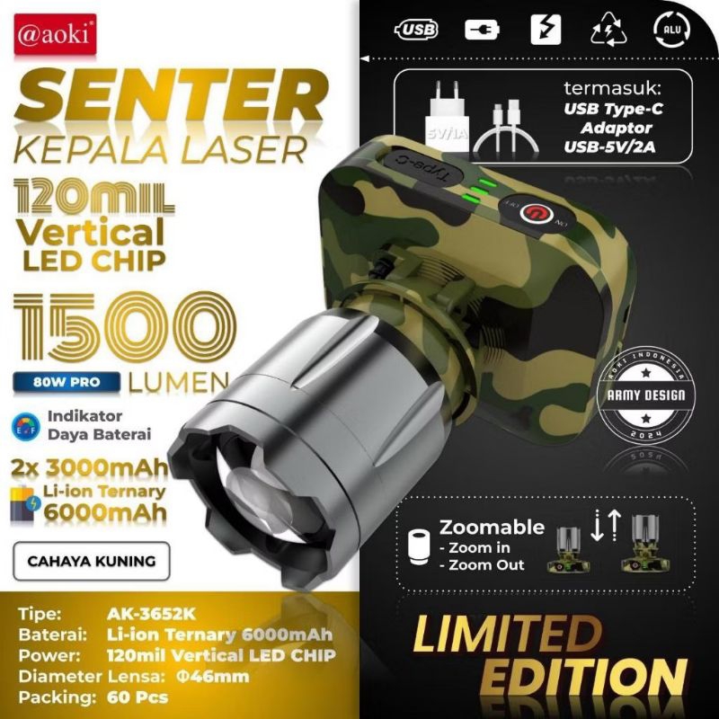Senter Kepala LED Zoom Laser 80 Watt PRO+ 1500 Lumen Aoki AK-3651A/AK-3652K Army PRO Cahaya Putih & Kuning Waterproof Su
