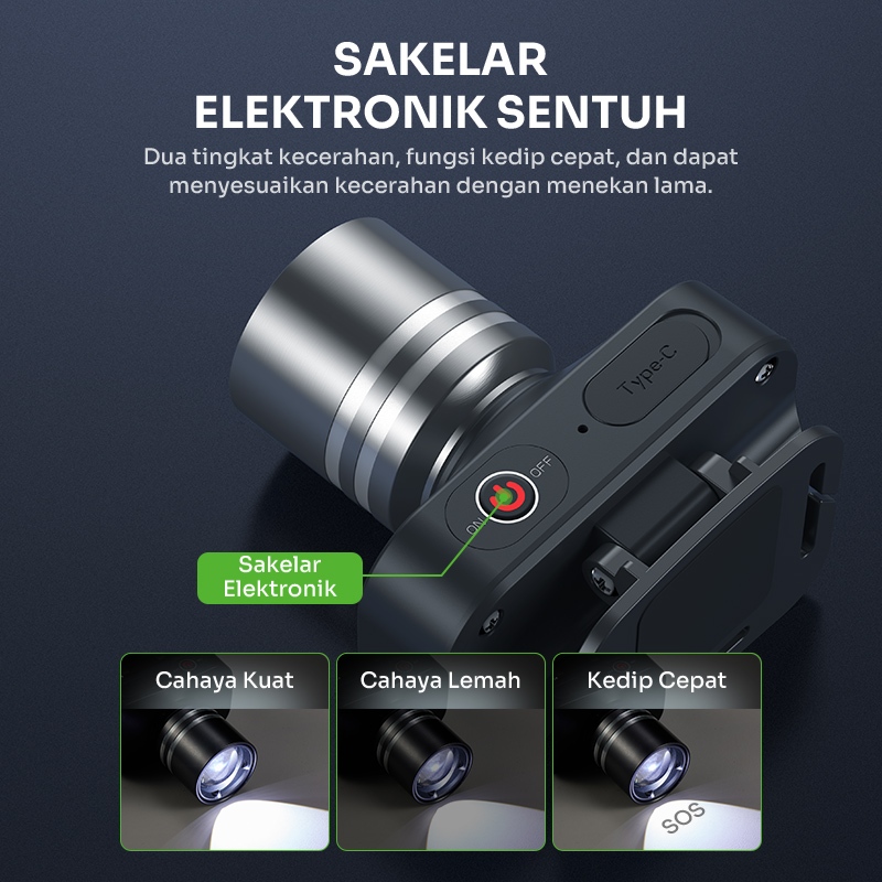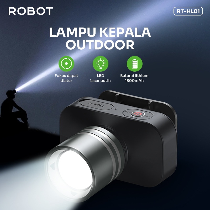 ROBOT Headlamp Outdoor/Emergency LED Lamp 1800mAh Focus Adjustable Rechargeable RT-HL01 Original - Garansi 1 Tahun