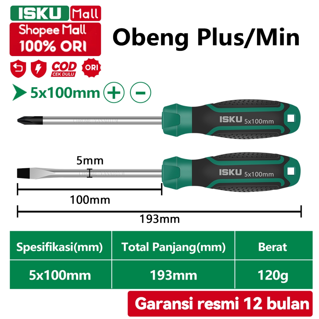 ISKU Obeng Magnet 2 pcs 5100mm Plus Minus + -/Obeng Set Kombinasi Tip Magnetik 2pcs