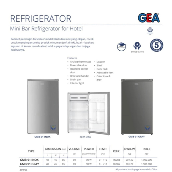 (INSTANT) KULKAS MINI BAR GEA GMB-91 1 PINTU 89 LITER 90 WATT