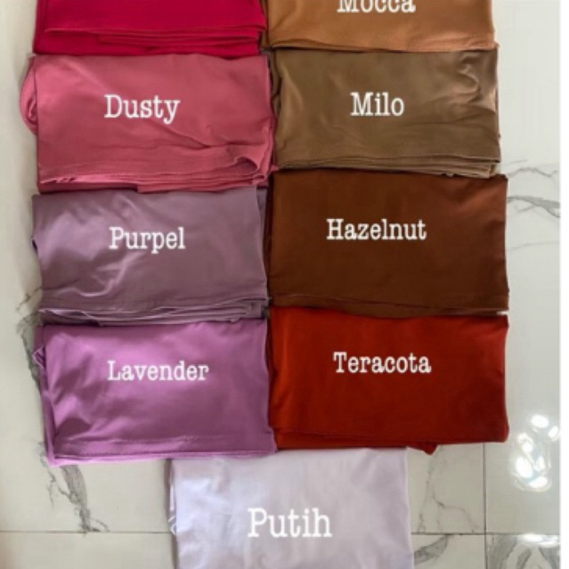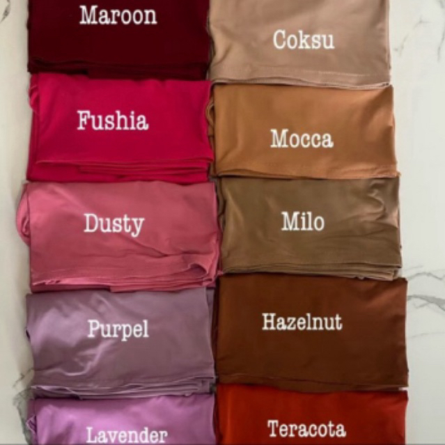 Hitam, Putih, Milky, Purple, Magenta, Fuschia, Dusty Pink, Wardah, Birel, Maroon, Abu Tua, Silver, Expresso, Mocca, Coklat Tua, Hazelnut, Milo, Coksu, Sage, Matcha, Hijau Botol, Lemon, Olive, Avocado, Mustard, Merah Cabe, Navy, Denim, Turkis