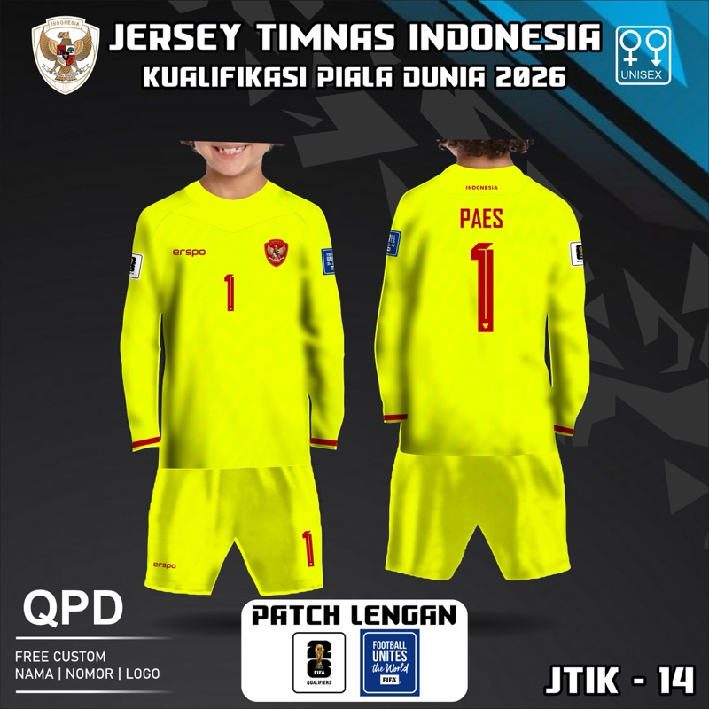 Setelan Jersey anak kiper timnas indonesia terbaru baju kaos bola piala asia U23 2024 free custom nama dan no punggung lengan panjang