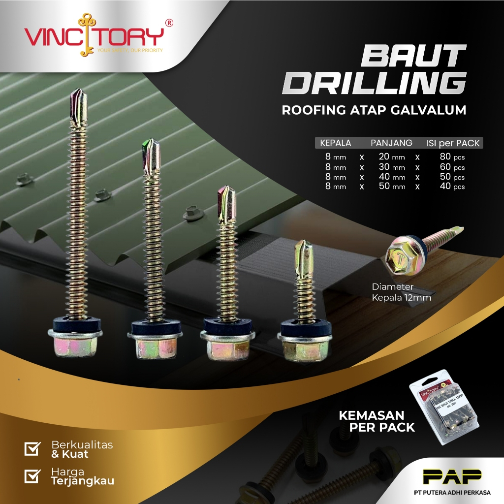 Vincitory Baut Drilling Rofing Atap Galvalum Uk 12X20, 12X30, 12X40,12X50 Ada Karet Baut Baja Ringan