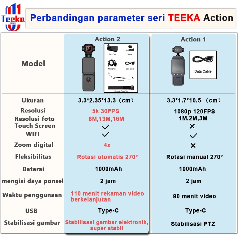 [TEEKA A1/A2] 1080P WiFi Action Kamera Pocket Vlog 270° Rotasi Lensa Mini Camcorder Dash Cam Police Body Motorcycle Bike Motion Camera