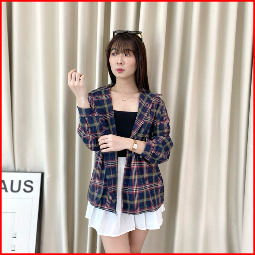 Ave Morin Ovs Shirt Flanel Kemeja Oversize Kotak Kotak Lengan Panjang Kemeja Wanita Kerja