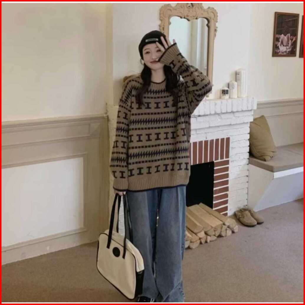 Sweater Pullover Leher Bulat Jacquard Longgar Yang Chic Untuk Wanita