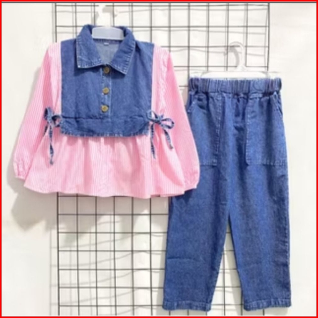 Stelan Anak Oneset Jeans Motif Salur Size3-12thn Stelan Elegan Kekininan