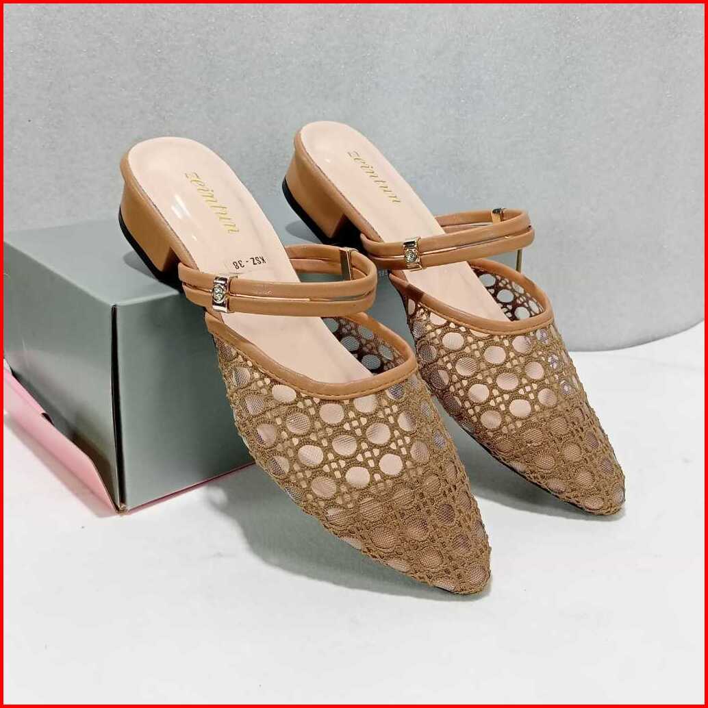 Sendal Sepatu Slop Heels Bustong Wanita Hak Tahu 3cm Brukat Permata