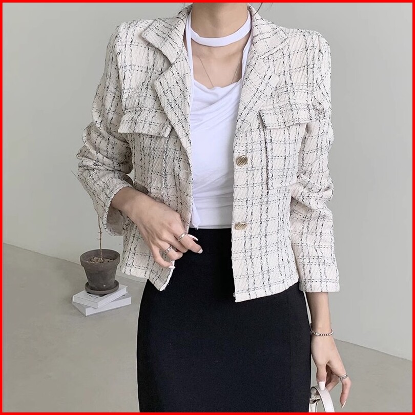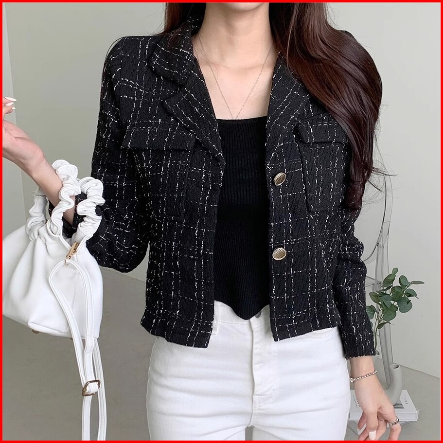 Qlioo Jaket Lengan Panjang Terbaru Untuk Wanita Jaket Kotak-kotak Pendek Jaket Lengan Panjang Gaya Korea