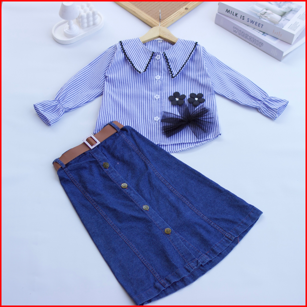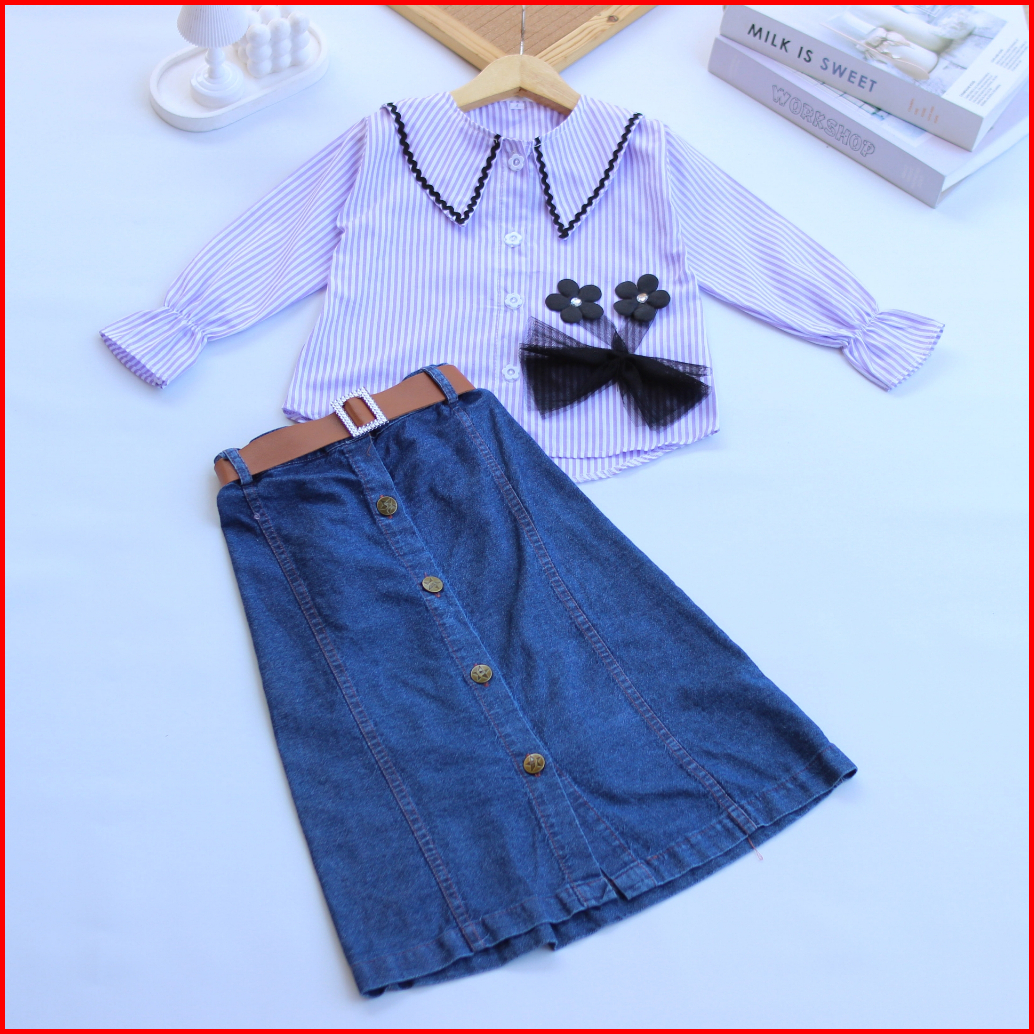 Setelan Rok Jeans Anak Ayura I Atasan Kemeja Motif Salur 1-12 Tahun I Fashion Anak Kekinian