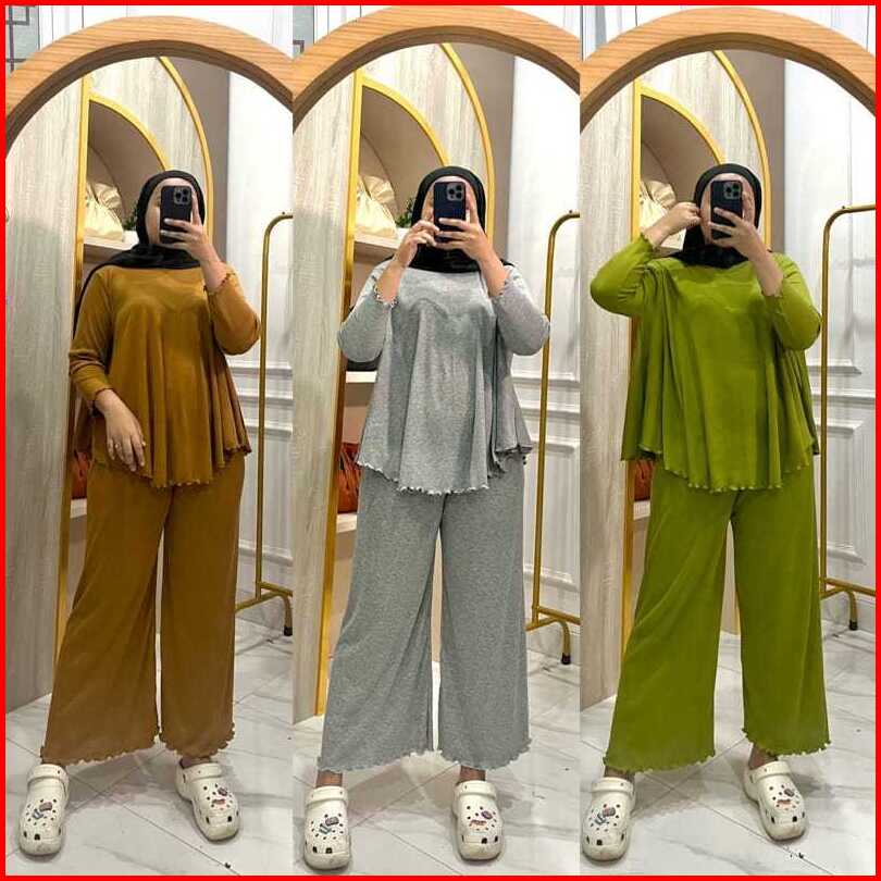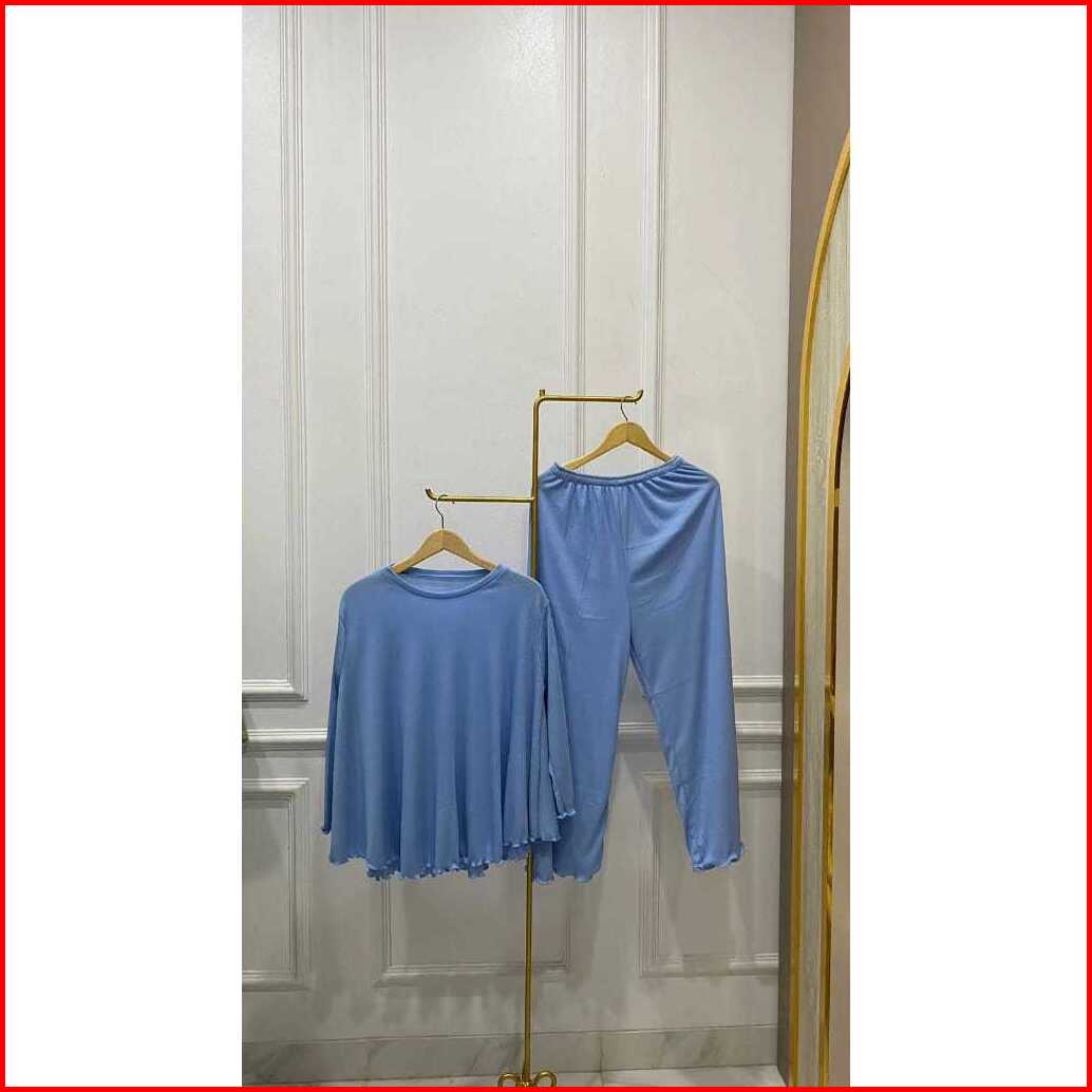 Atachi Setelan Rib Knit Wanita Lengan Panjang Celana Panjang Baju Atasan Setelan Wanita Dewasa Polos