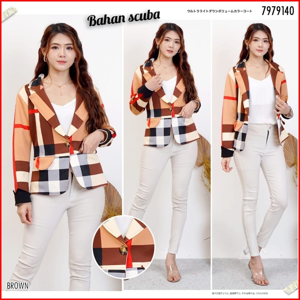 Blazer Wanita Scuba Import Motif Kotak Terbaru