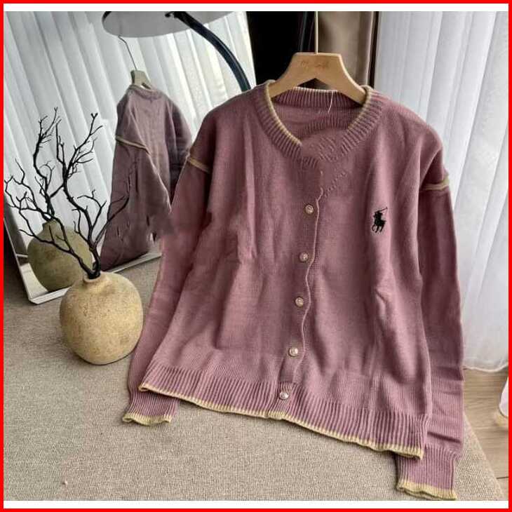 Knitwear Korean Style Cardigan Rajut Wanita Motif Simpel Bordir Horse Lengan Balon Tops Oversize