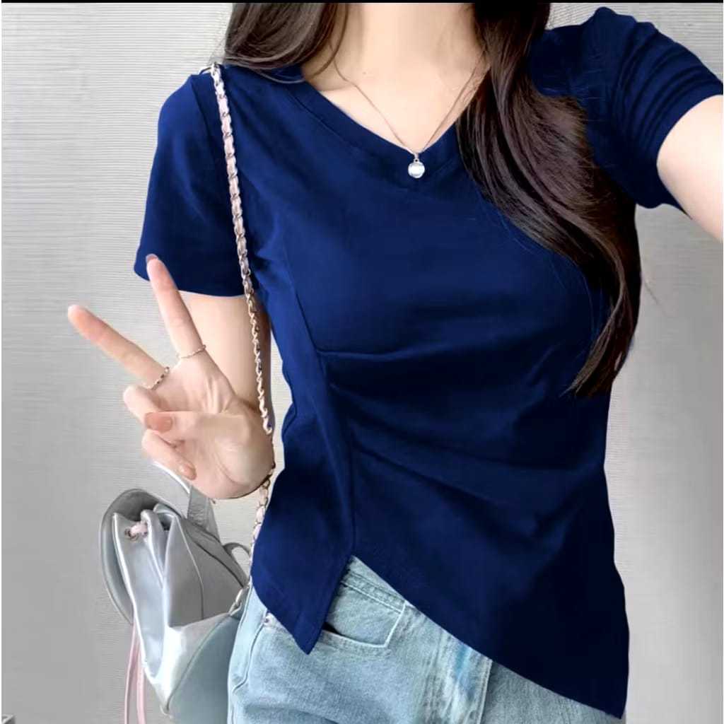 Lisz Fashion / Atasan V-Neck Lengan Pendek Lipatan Slit Asimetris Samping / Kaos Atasan Wanita korean Kekinian Unik 6065
