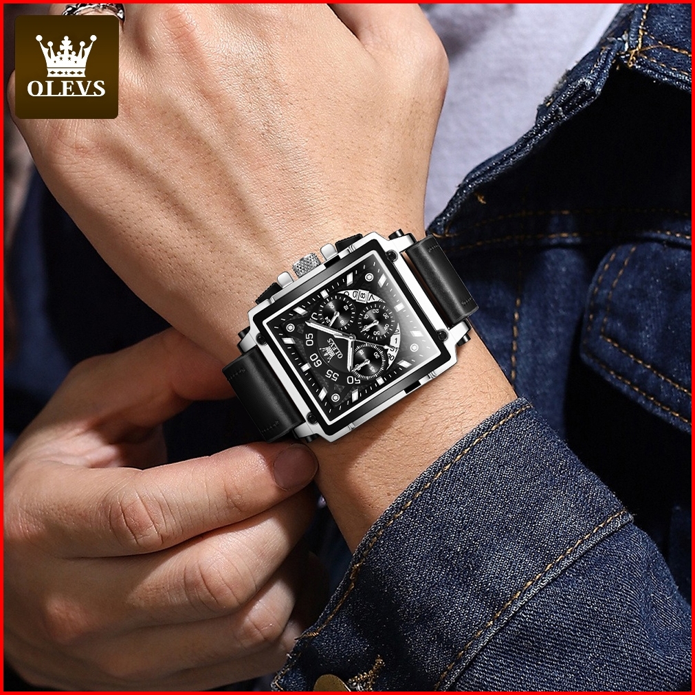 Olevs Jam Tangan Pria Kulit Anti Air Original Asli Terbaru Casual Tahan Air Square Chronograph Leather Dengan Kotak Tang