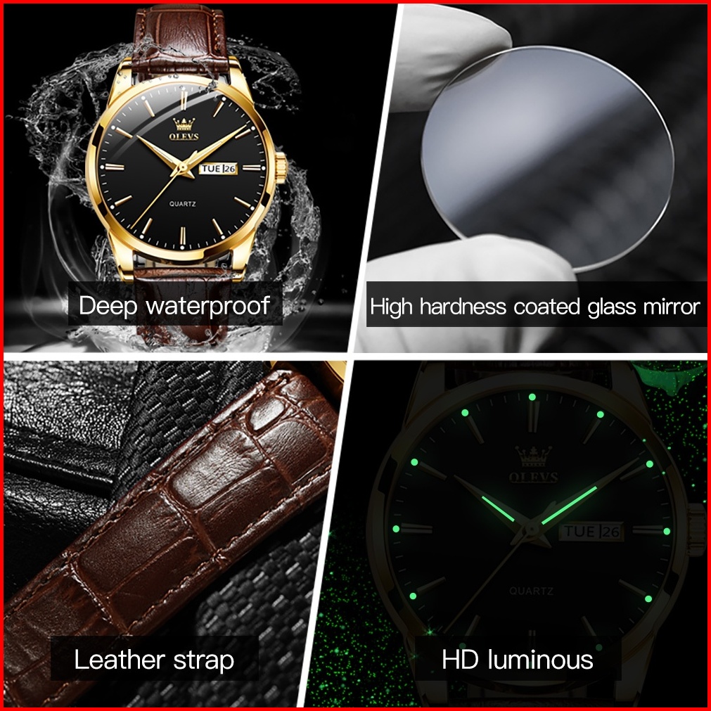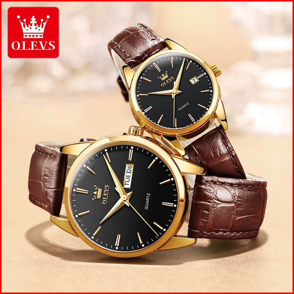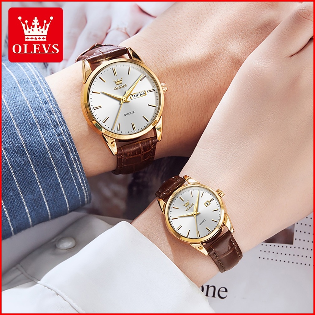 Olevs Jam Tangan Couple Pria Wanita Original Anti Air Analog Kulit Terbaru 2025 Tanggal Otomatis Kuarsa Bercahaya Couple