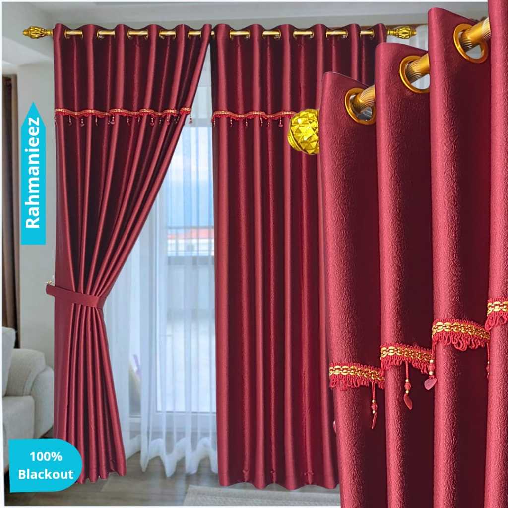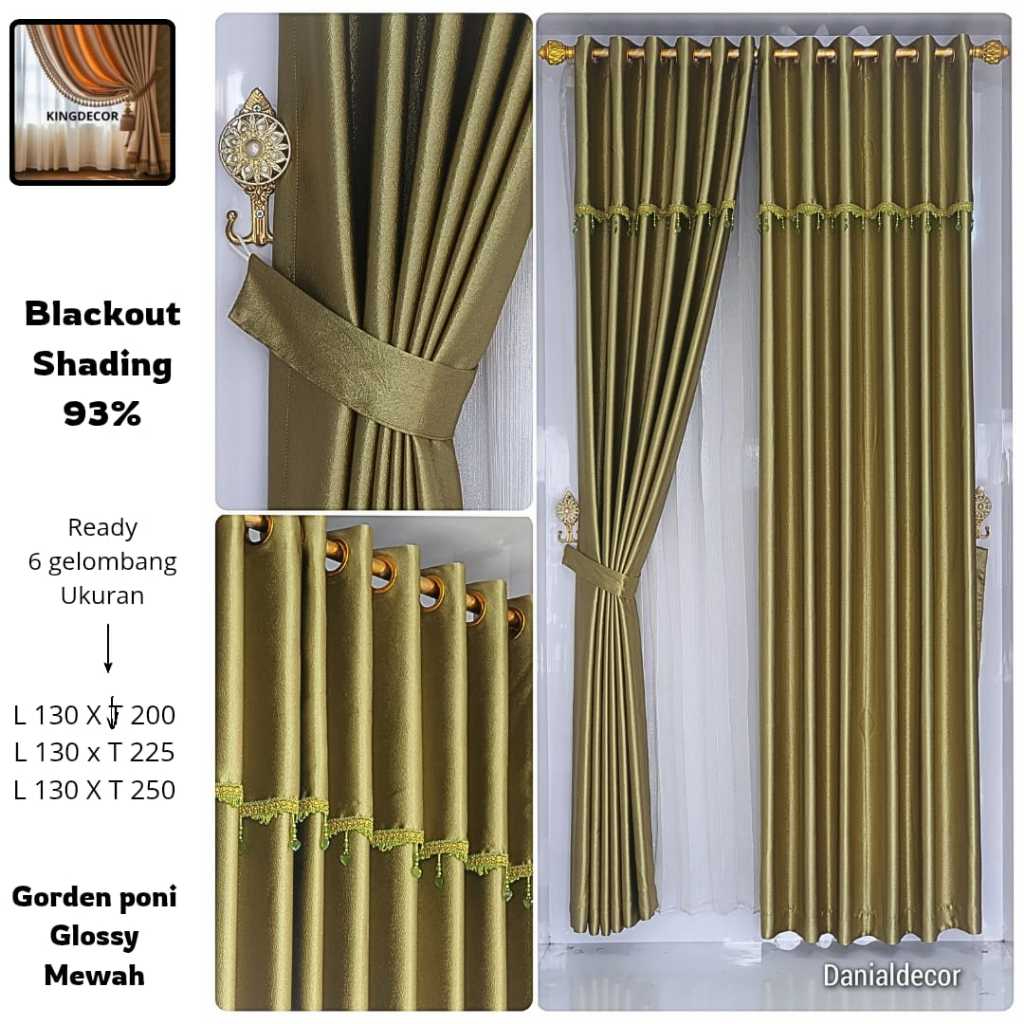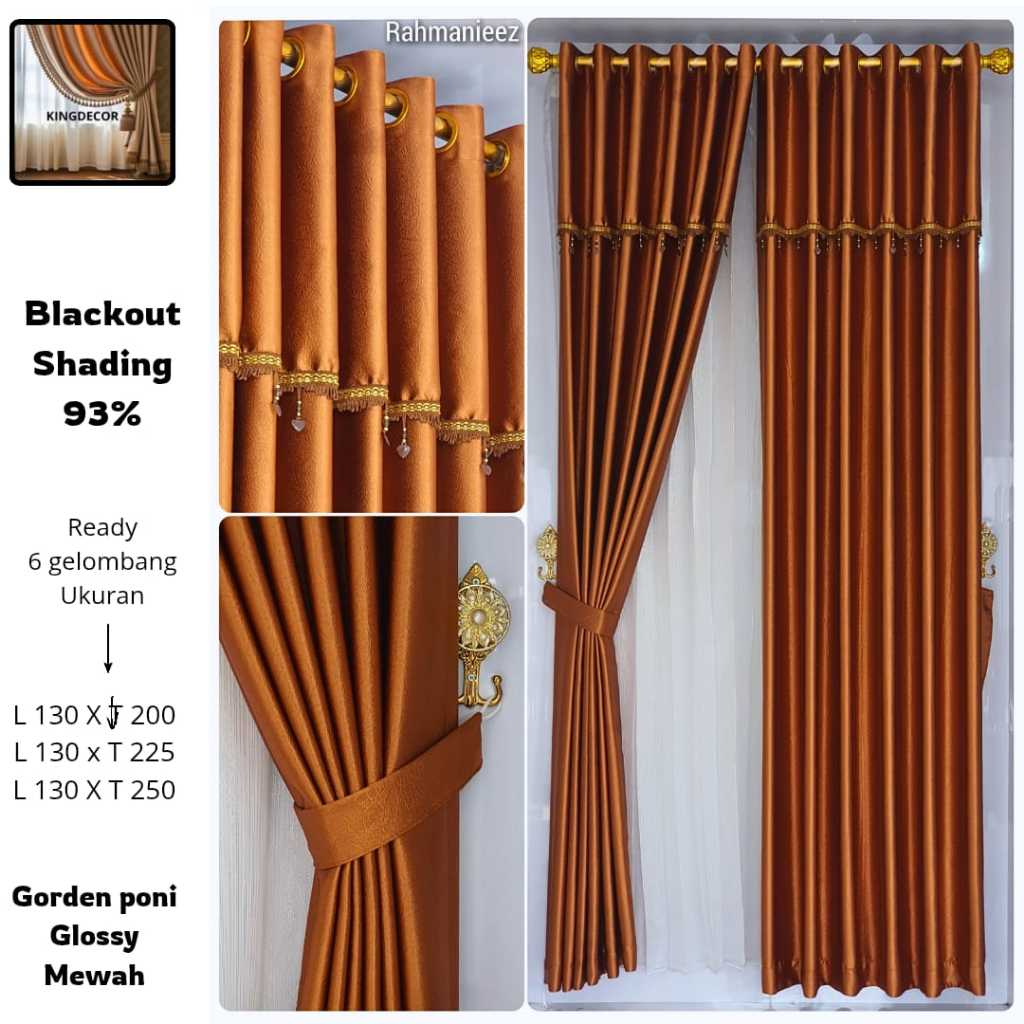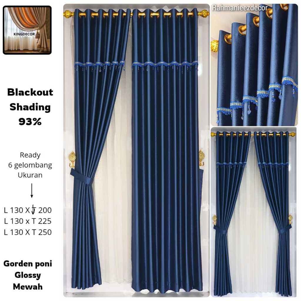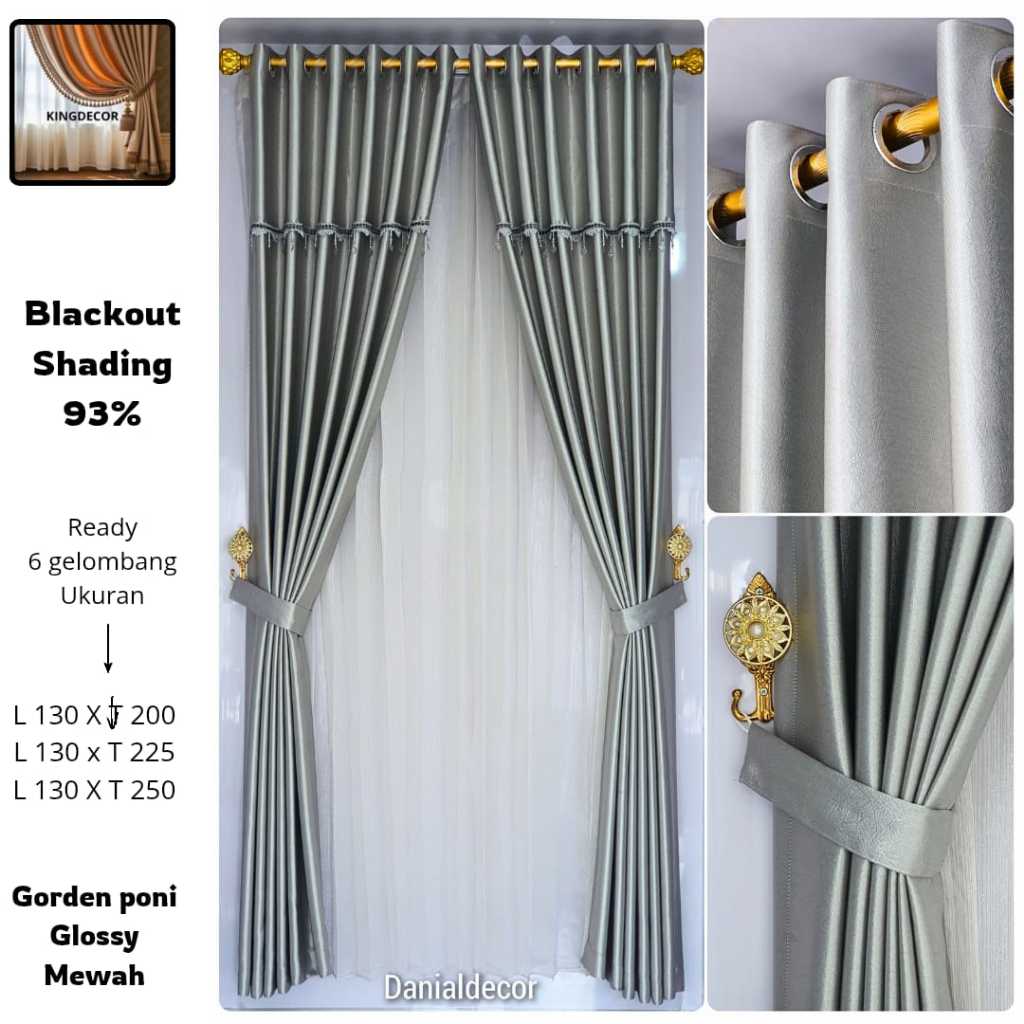 Gorden Blackout Polos Tebal Glossy Premium Uap, Poni Kristal Ring Lengkap Tali Hook