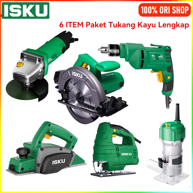 Garansi 1 tahun [6 ITEM] ISKU Paket Tukang Kayu Lengkap Mesin Planer/Serut + Circular Gerinda Saw + bor 10mm+Mesin Gerinda+Mesin Profil KAYU+Mesin Gergaji kayu Jig Saw