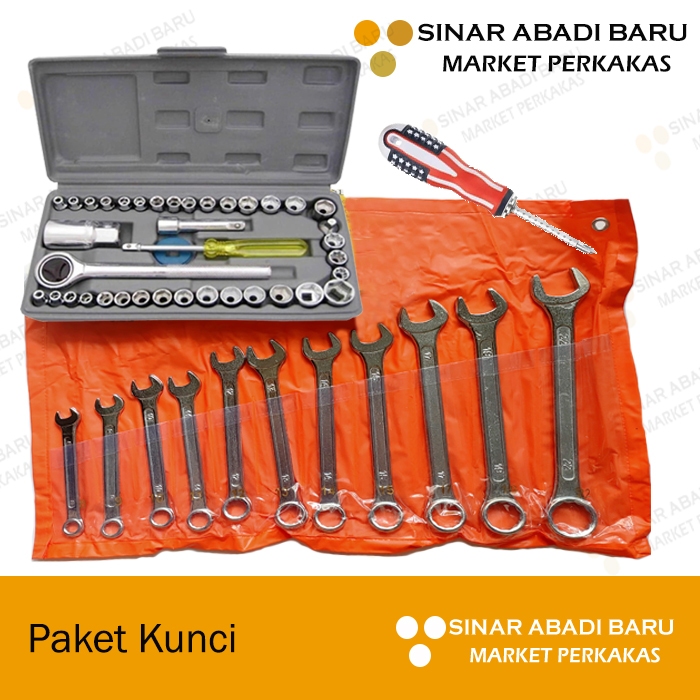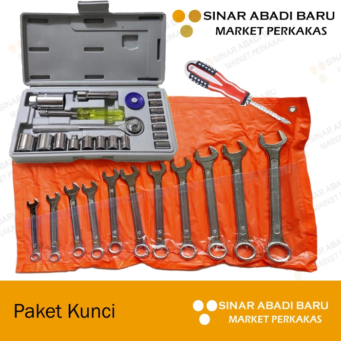 Paket Kunci Ring Pas Set 8-22 Mm 11 Pcs + Kunci Sok Shock 21 Pcs + Obeng Bolak Balik Amerika