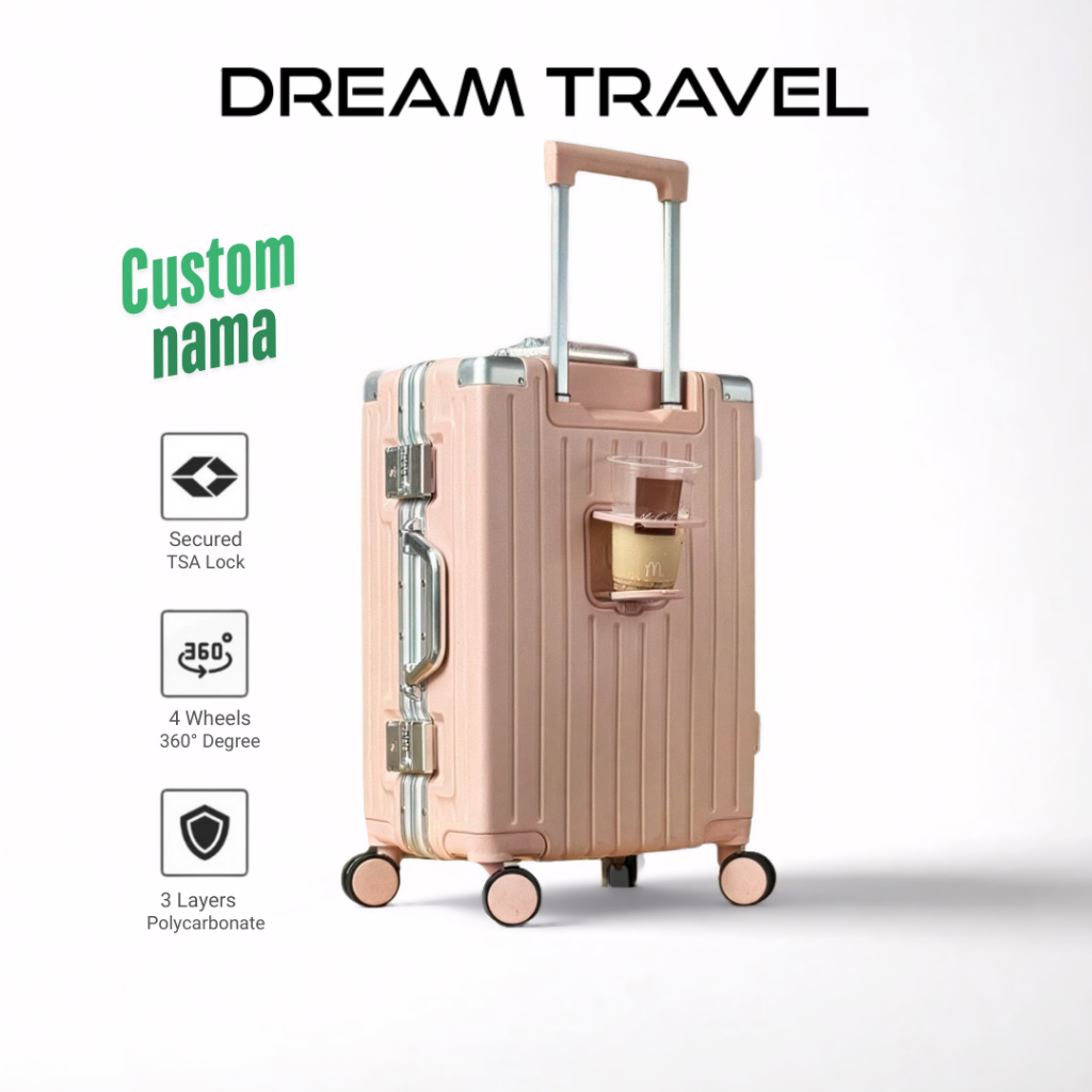 Dream Koper 20 Inch - 24 Inch Dgn Tempat Gelas Free Custom Nama & Logo Tsa Lock Roda 360° Kabin M106