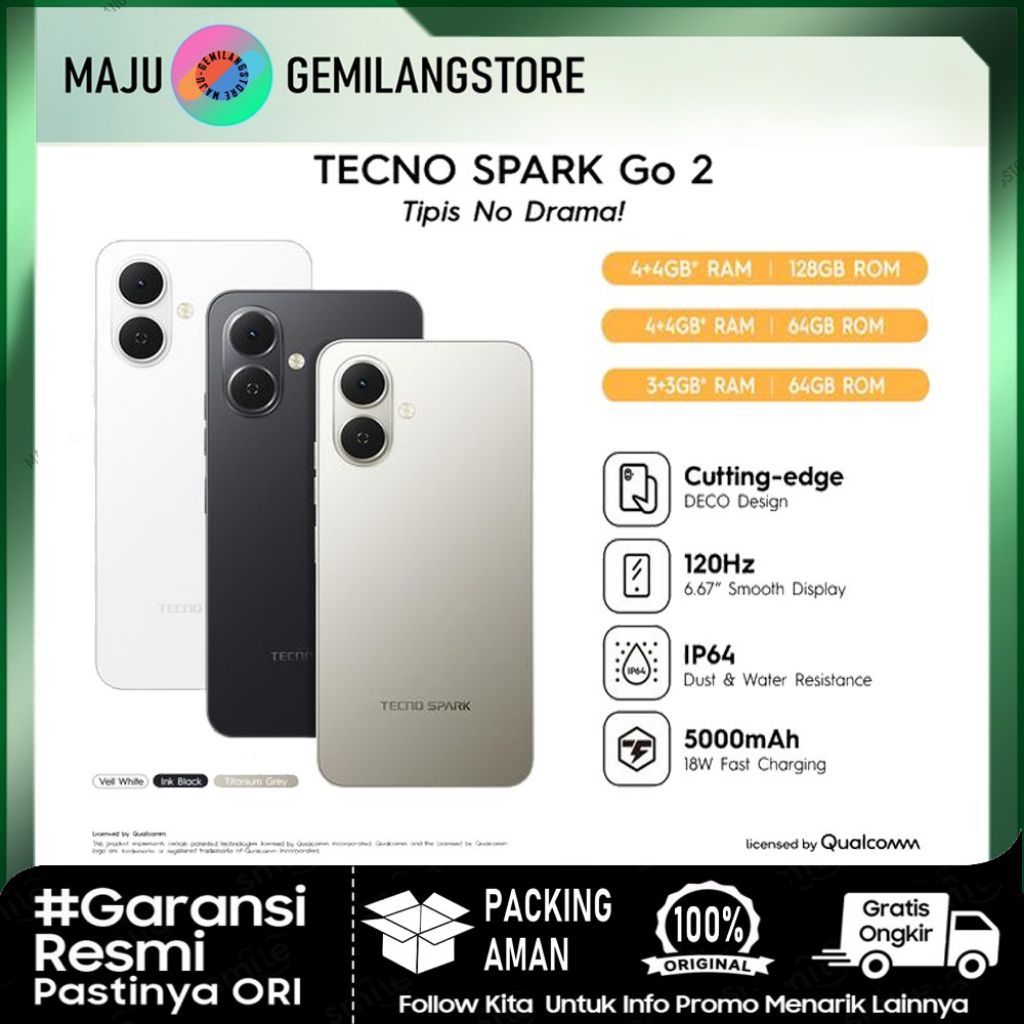 TECNO SPARK GO 2 ‐ 3+3GB & 4+4GB + 64GB/128GB , LAYAR 6.67" HD+ 120Hz | 5000mAh+18W Charging | Android 15 Go Edition