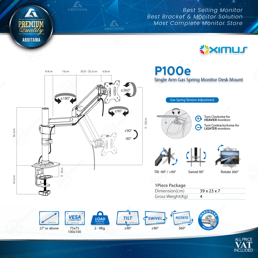 BRACKET MONITOR DESKMOUNT GAS SPRING OXIMUS P100e TILT SWIVEL ROTATE