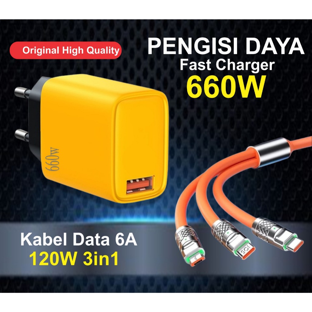 Charger 660W Batok 131 + Kabel Data 3in1 (Micro, Type C, & Lightning) Pengisian Daya Cepat 6A Super Quick Charging