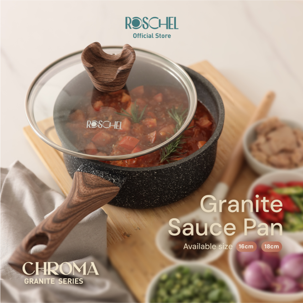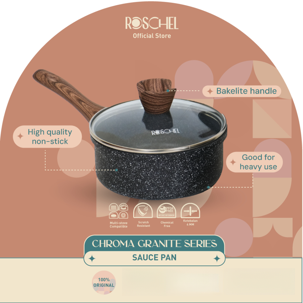 Roschel Chroma Granite Saucepan 16 cm , 18 cm + Tutup Kaca Non-Stick Greblon C3 German Coating Panci Susu Anti Lengket S