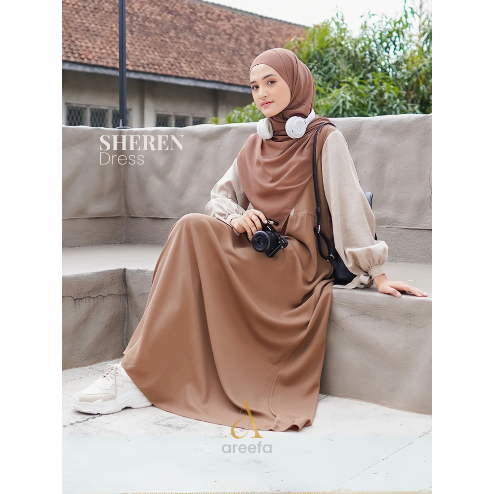 Areefa - Gamis Wanita Remaja SHEREN Dress Overall Look Bahan Edelyn Kombinasi Madina Polos 2 Warna