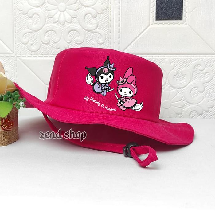 Topi anak perempuan gambar kuromi dan melody sanrio Topi rimba anak pakai tali Fashion - Merah Kuromi & Melody