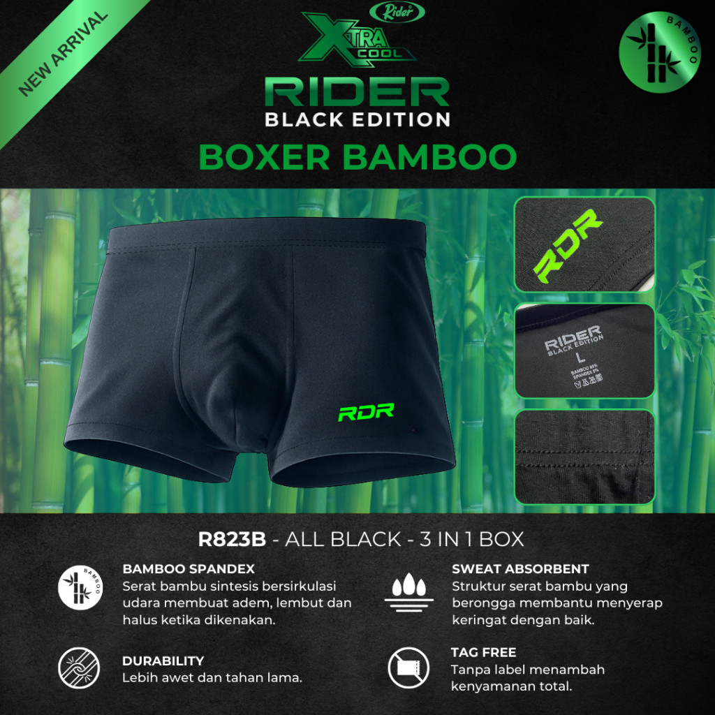 P&I SHOP Rider Xtracool Black Edition Boxer Bamboo - Boxer Pria Bamboo R823B isi 3 Pcs