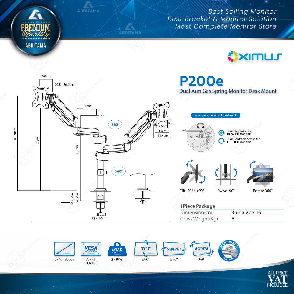 BRACKET MONITOR DESKMOUNT GAS SPRING OXIMUS P200e TILT SWIVEL ROTATE