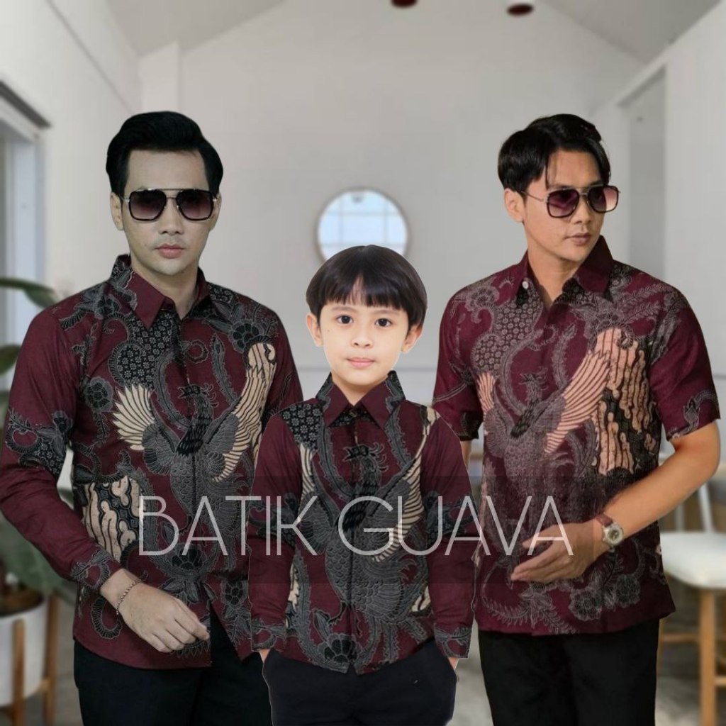 BATIK GUAVA - Kemeja Batik Pria lengan Panjang - Batik couple Ayah dan Anak Laki-laki merah Burgundy