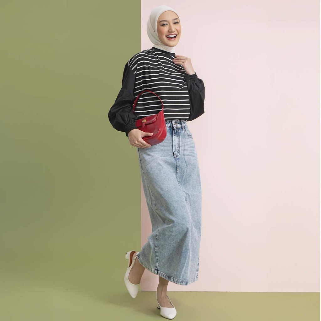 SEALANE STORE HijabChic Akanni Black Stripe Top - Kaos Combed Garis Lengan Balon Simple
