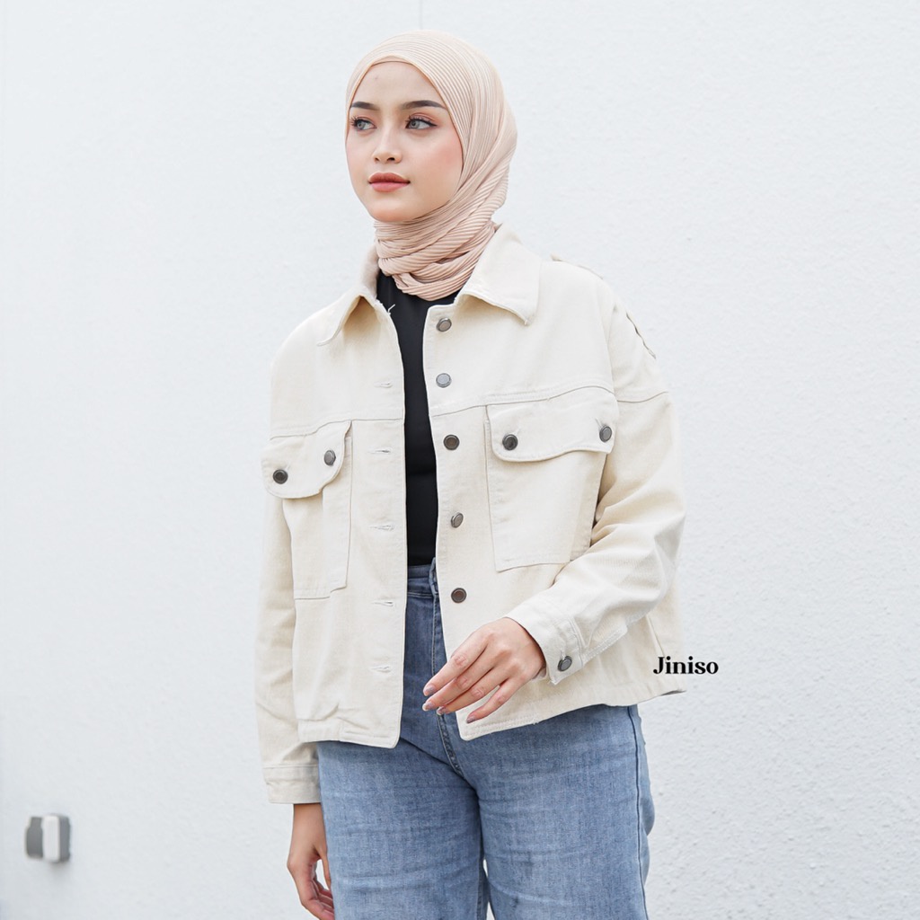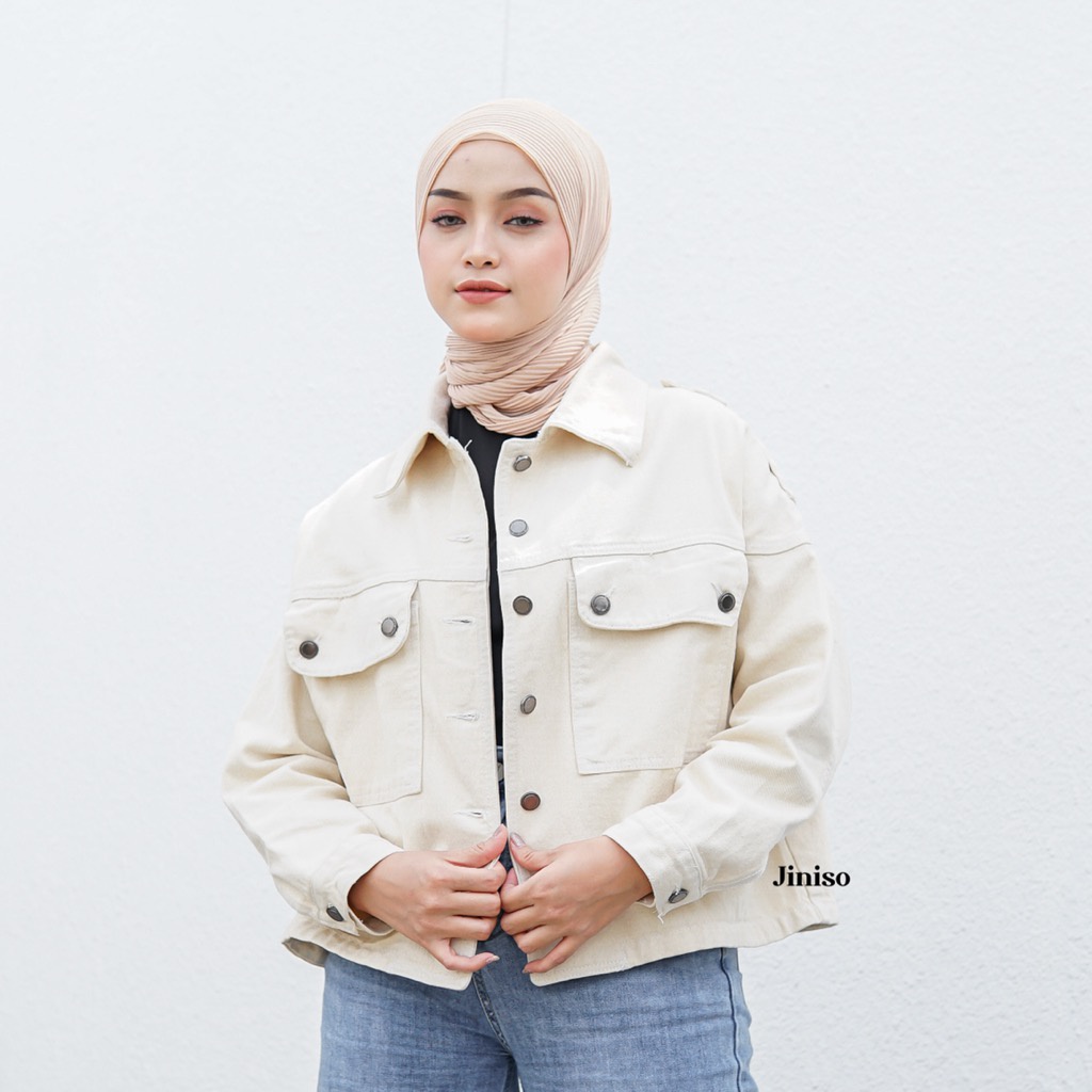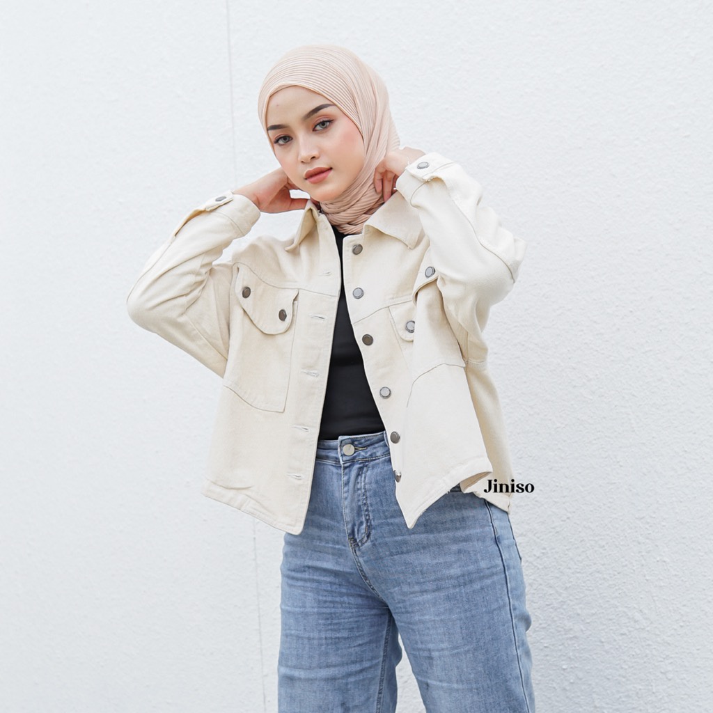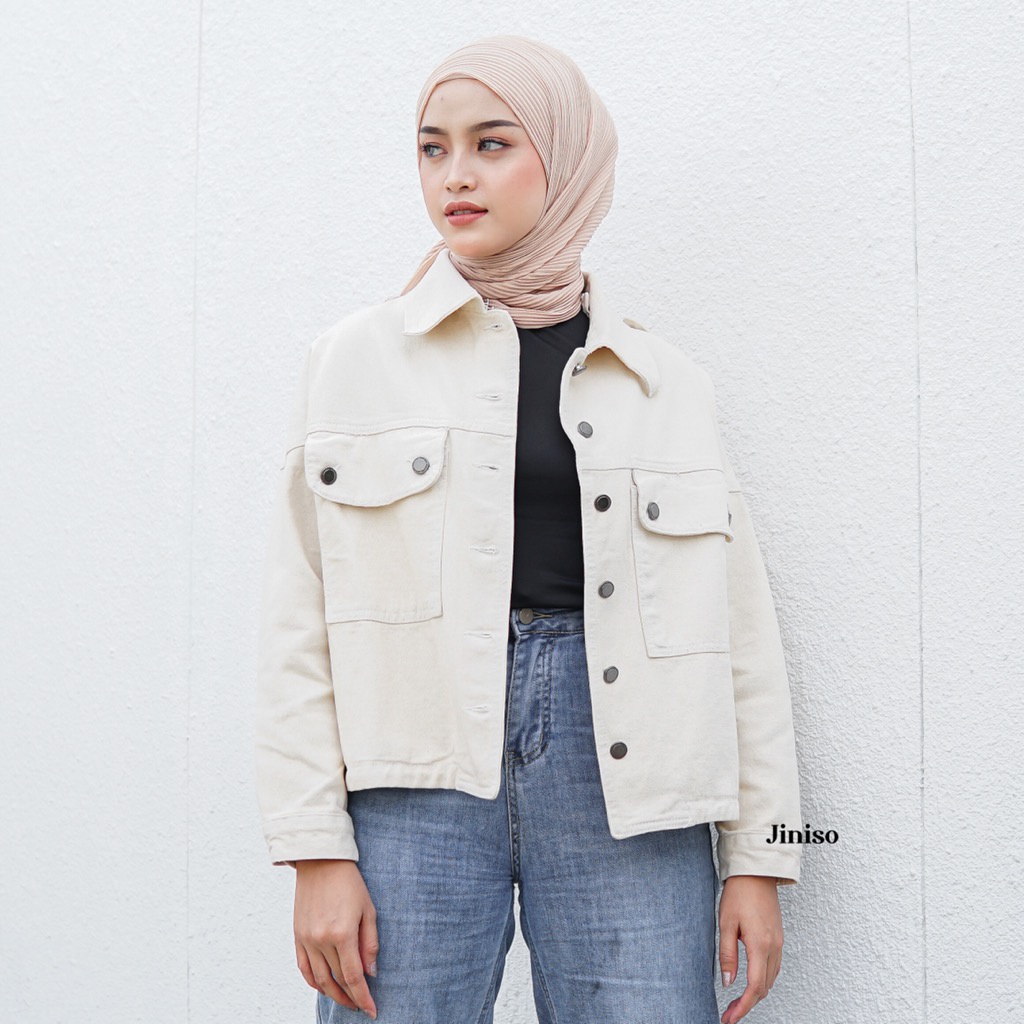 SEALANE STORE JINISO Jaket Crop Jeans Oversize Pocket Khaki