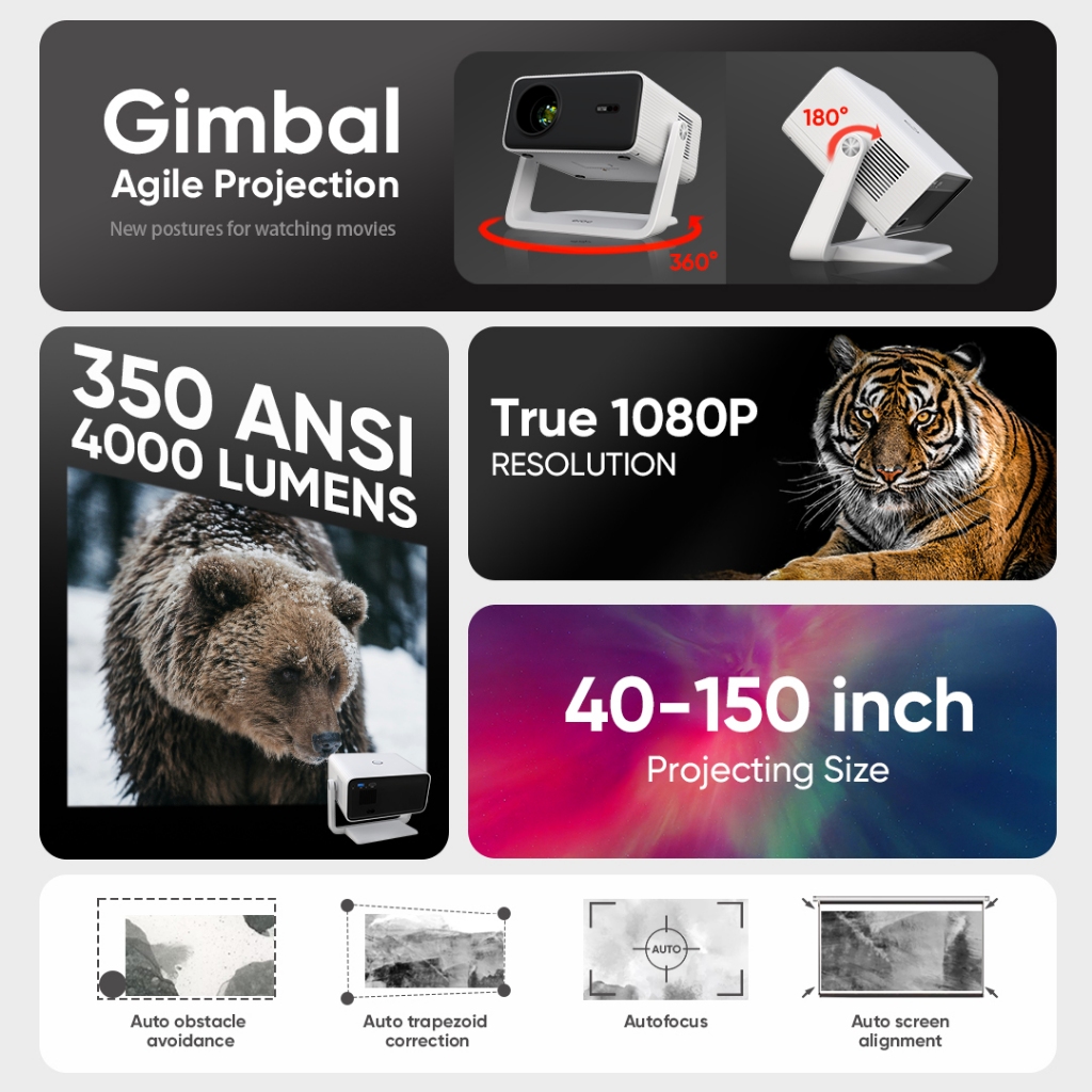 EROC Smart Proyektor LCD 350 ANSI Full HD Gimbal Agile Projection Display 150" - Auto Focus - FLIP