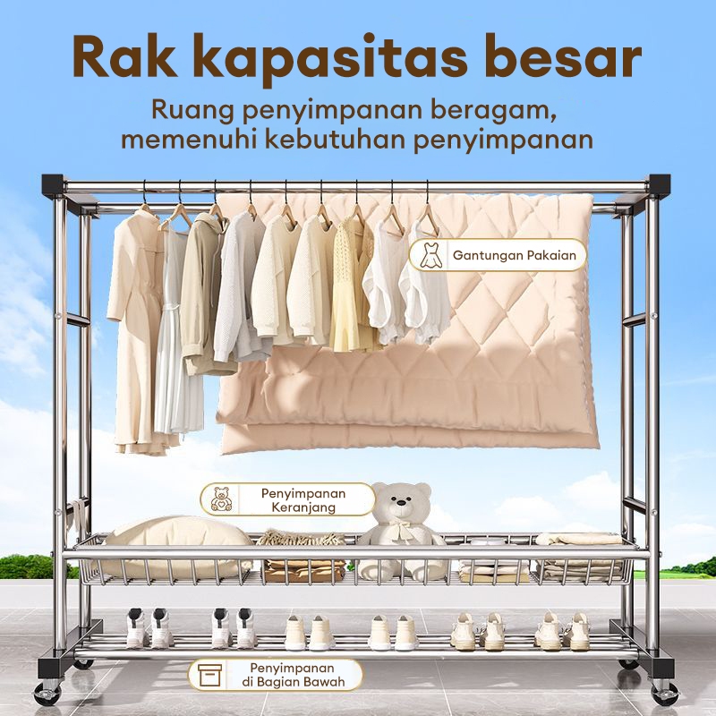 Jemuran Baju Besar Kokoh Stainless Steel Jemuran Baju Tabung Baja Gantungan Baju Berdiri Stainless