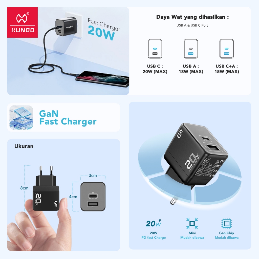 XUNDD GaN PD 20W TYPE C USB Fast Charger Kepala Mini Wall Charger Travel Kepala Adaptor Dual Port