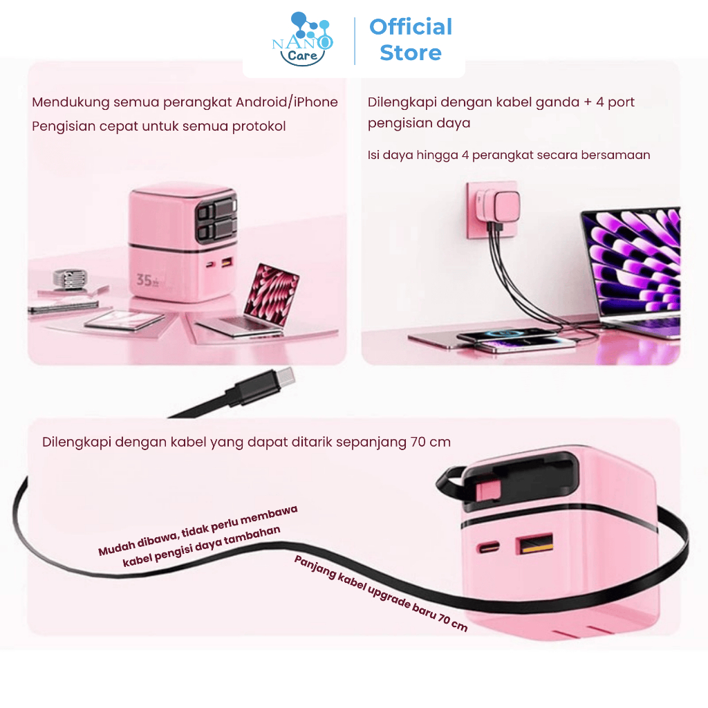 Nano Care GaN Fast Charger With Retractable Cable Wall Charger PD 35W 4IN1 Android & Iphone Adapter