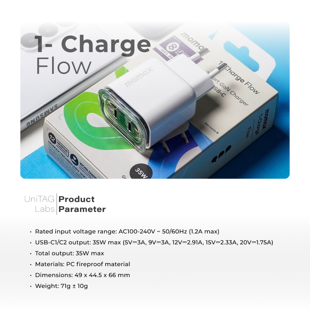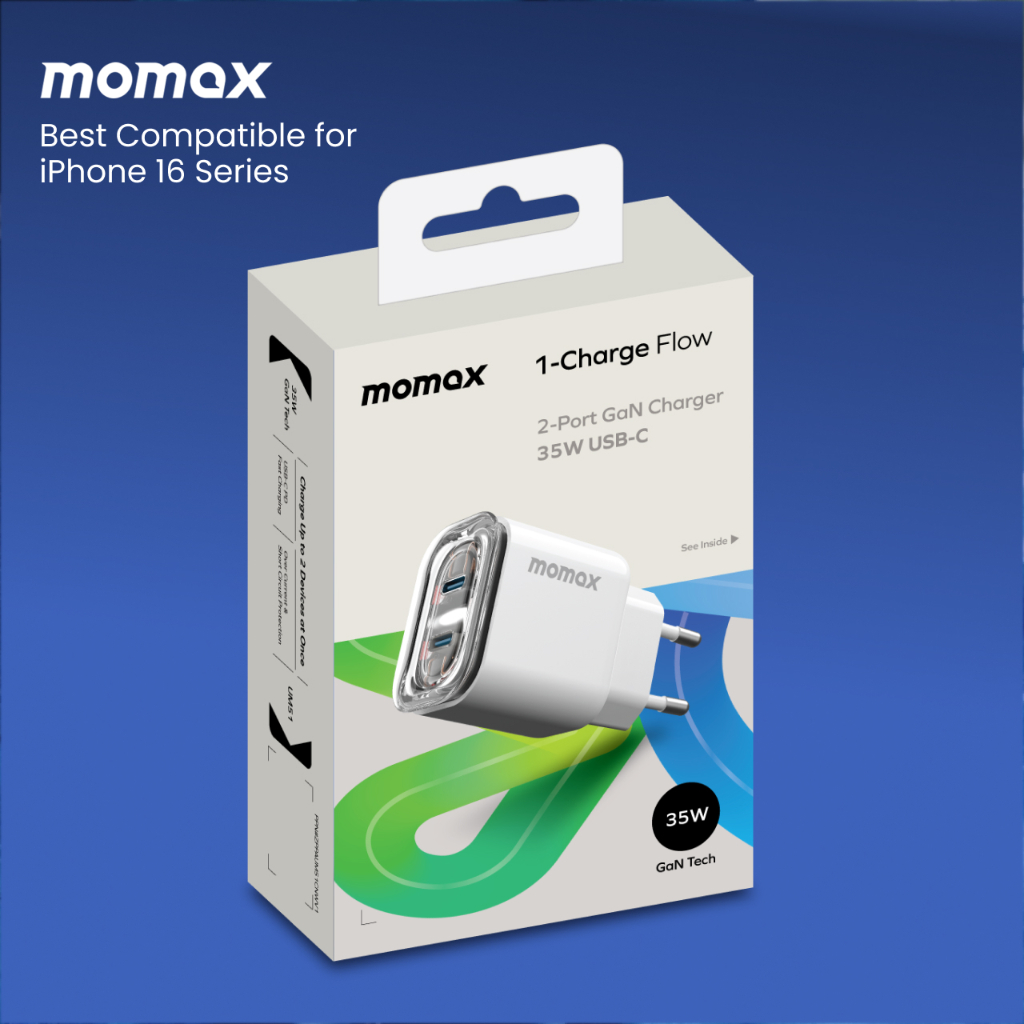 Momax Kepala Charger Adaptor USB Type C for iPhone Samsung 1-Charge Flow 35W PD GaN Dual Port