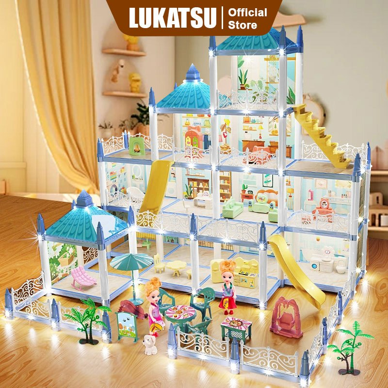 LUKATSU Mainan Rumah Boneka Princess Castle Rumah Princess Rumah Boneka Villa Princess Castle Dengan Lampu Dan Boneka Ma