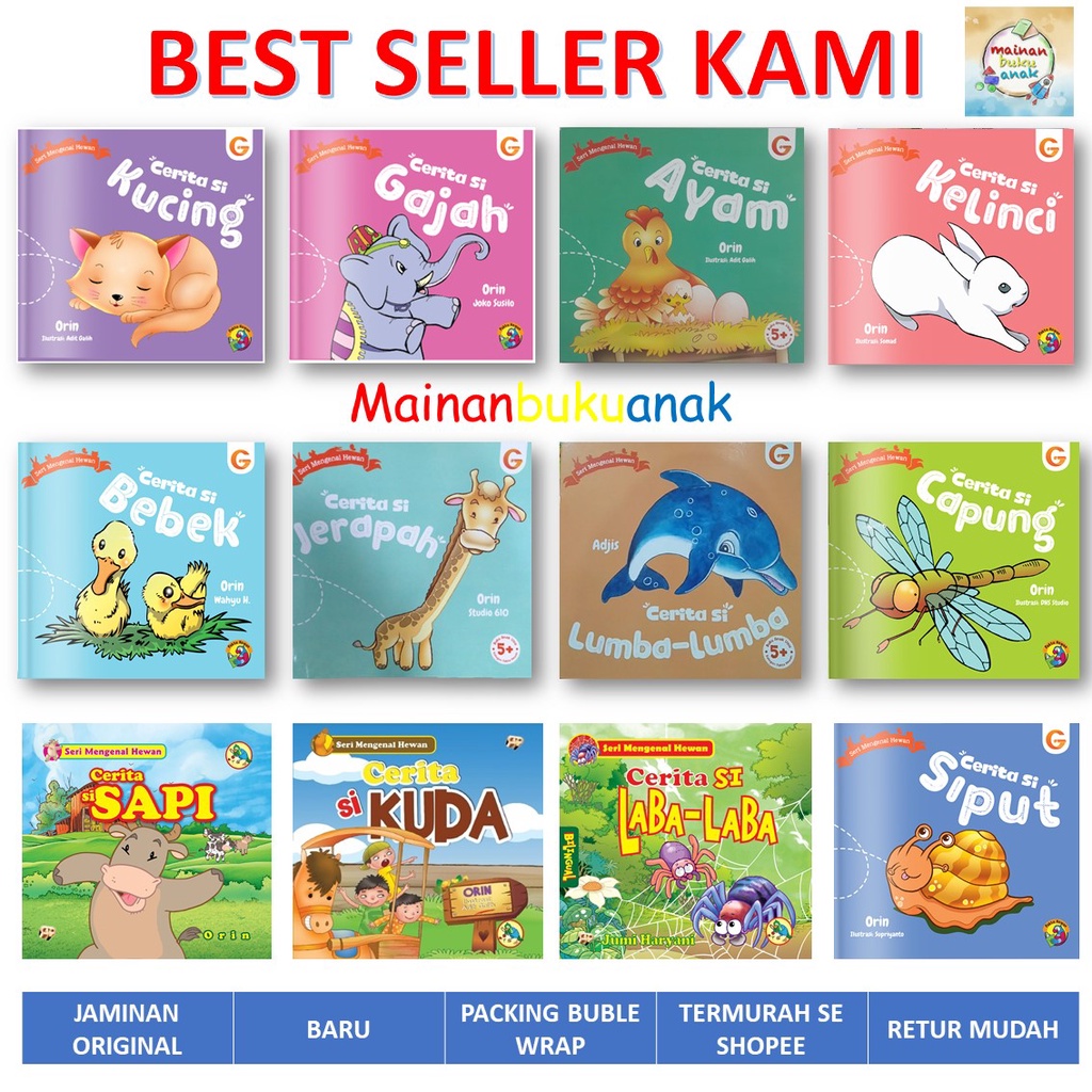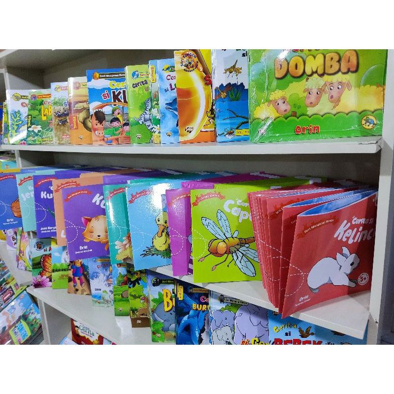 Cerita Si Kucing, Cerita Si Ayam, Cerita Si Gajah, Cerita Si Kelinci, Cerita Si Bebek, Cerita Si Jerapah, Cerita Lumba-lumba, Cerita Si Capung, Cerita Si Sapi, Cerita Si Kuda, Cerita Si Laba-Laba, Cerita Si Siput, Cerita Si Lebah, Cerita Si Katak, Cerita Si Kupu-Kupu, Cerita Si Domba, Cerita Si Semut, Cerita Burung Hantu, Cerita Si Kura-Kura, Cerita Si Buaya, Cerita Si Singa, Cerita Si Kuda Nil, Cerita Si Zebra, Cerita Si Unta, Cerita Si Penyu