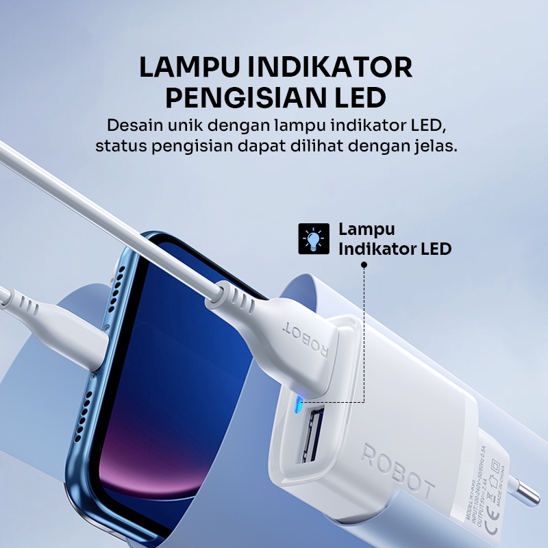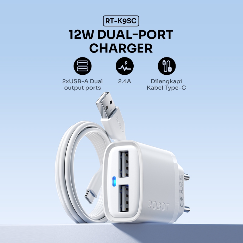 ROBOT Adaptor Charger 12W Dual-Port 2.4A with Type-C Cable LED Indicator RT-K9SC Original - Garansi 1 Tahun
