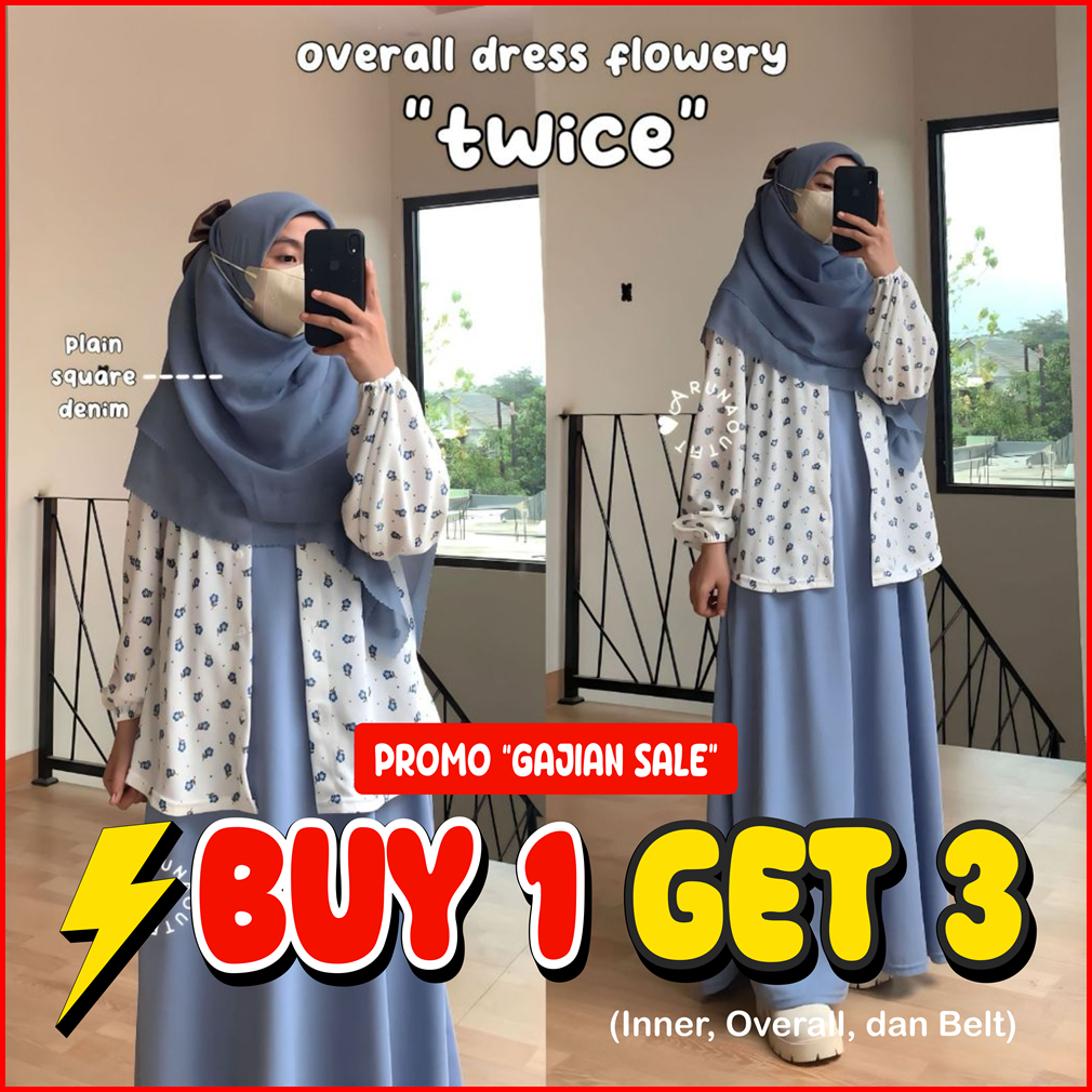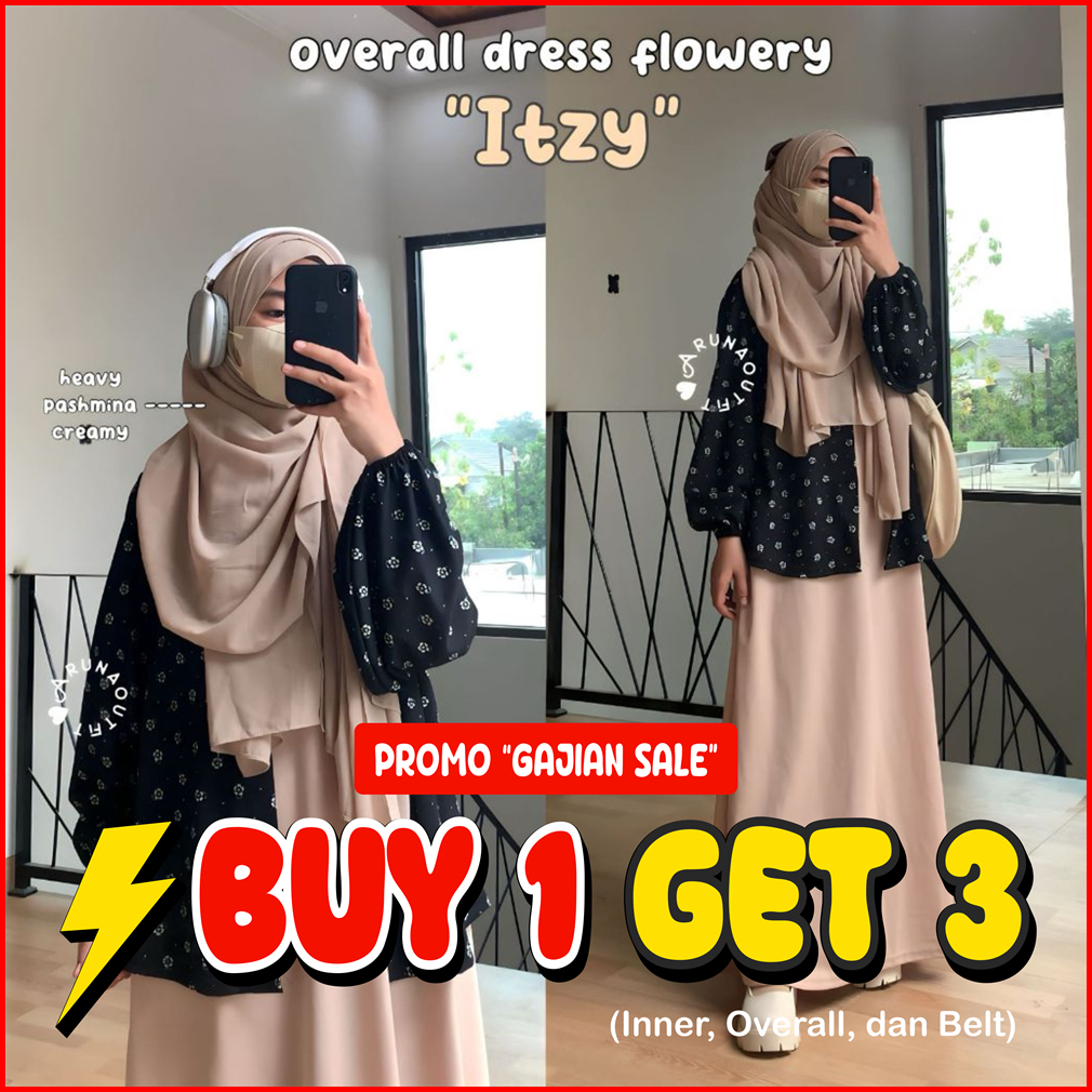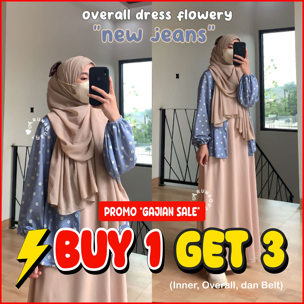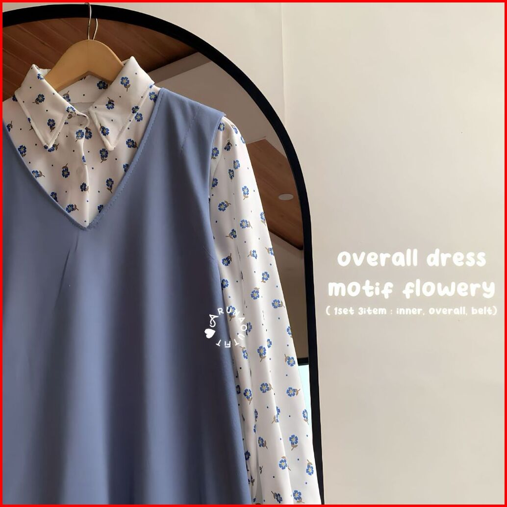 Arunaoutfit - Korean Overall Flower 1set Inner Kemeja Overall Dress Belt Oneset Dress Remaja Murah