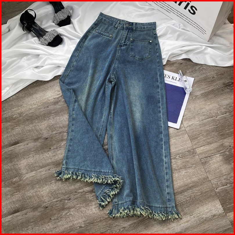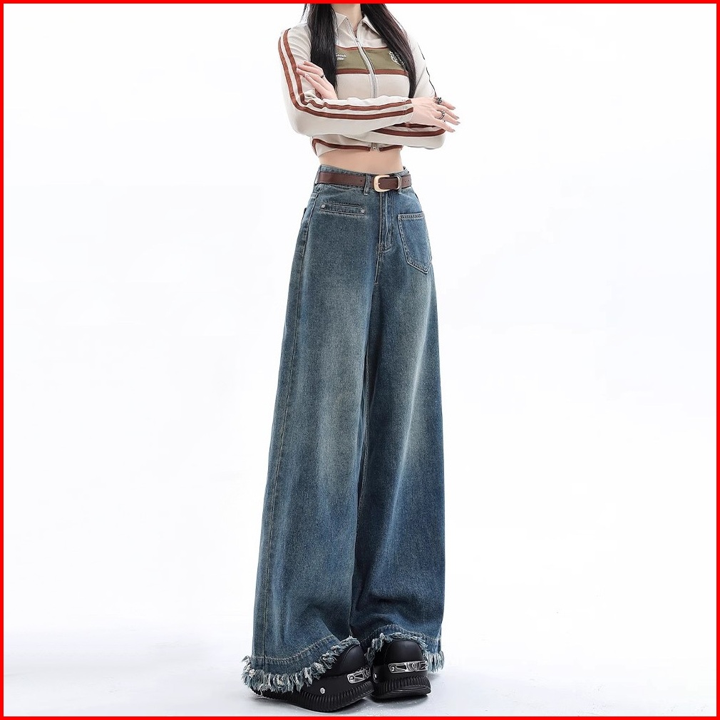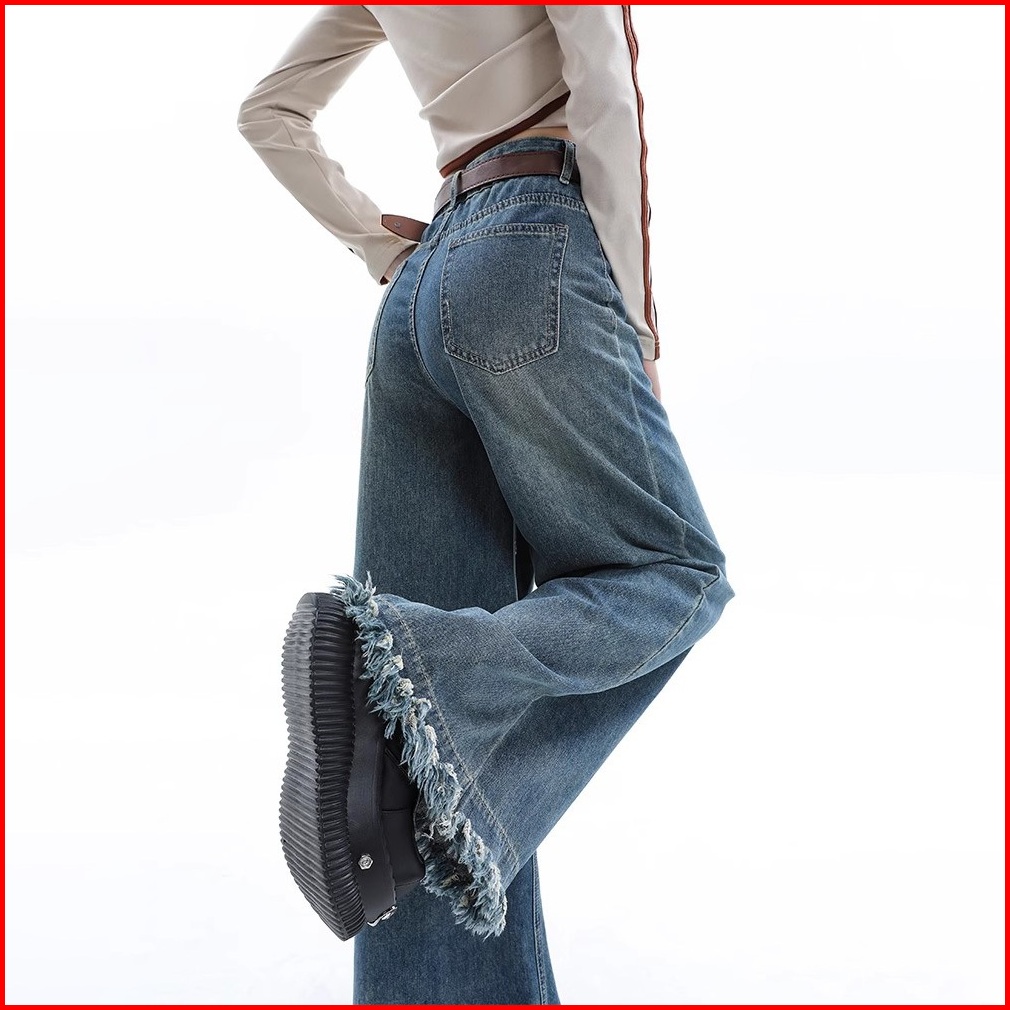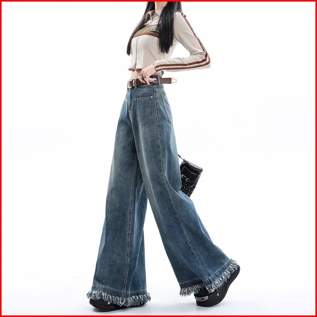 Elegan.girl Celana Jeans Wanita Kaki Lebar Retro Untuk Wanita Celana Panjang Lantai Rumbai Tepi Mentah Pinggang Tinggi