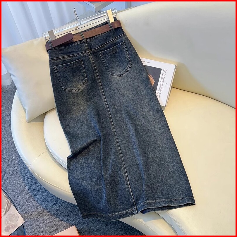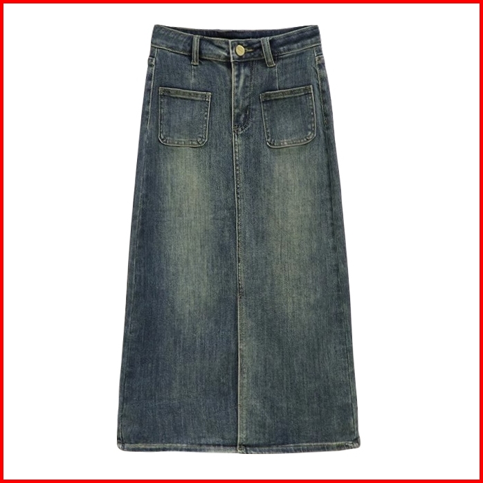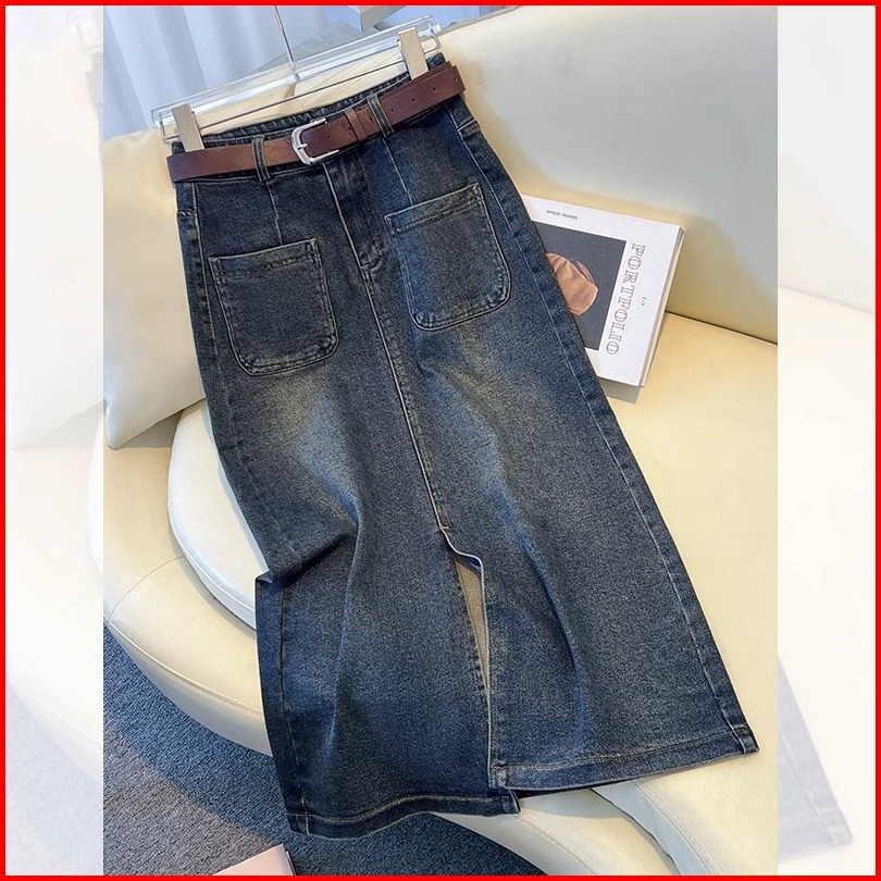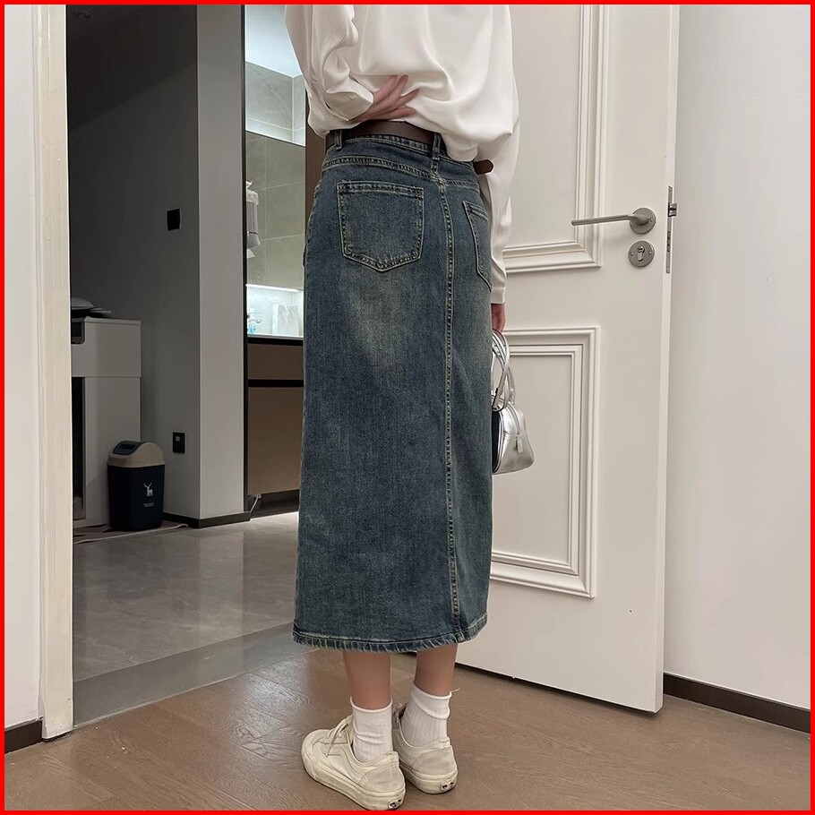 Elegan.girl Ready Stok Rok Denim Wanita Rok Trendi Pinggang Tinggi Belahan Retro A-line Panjang Menengah 2024 Baru