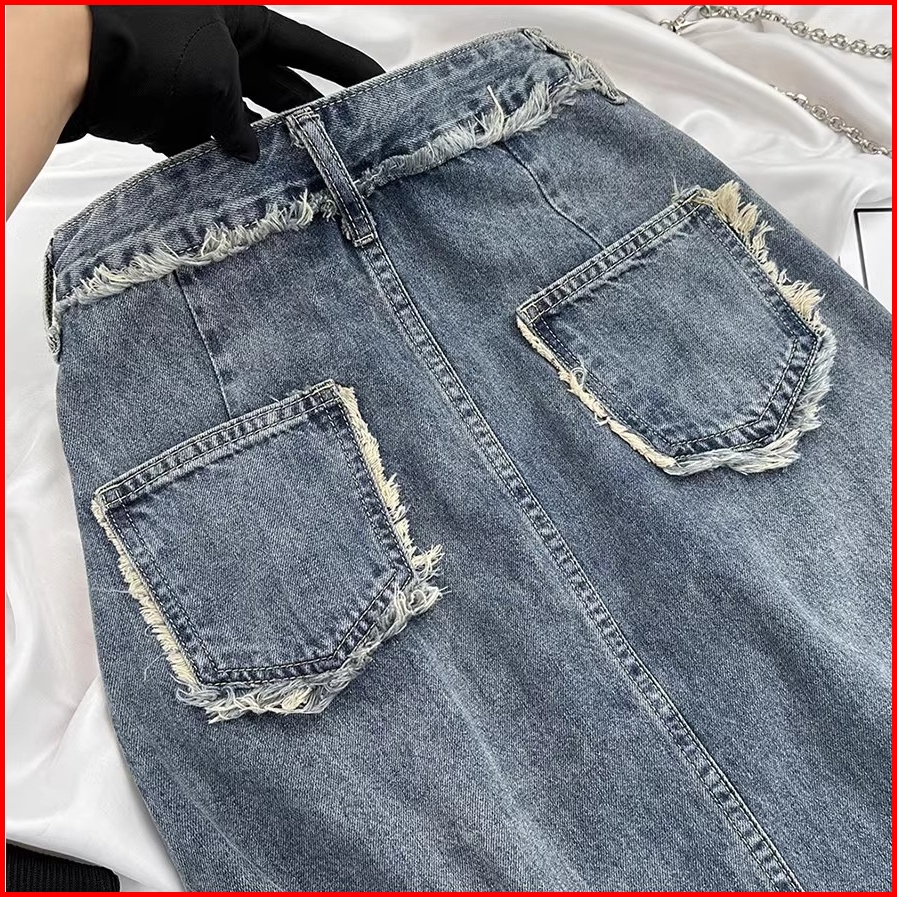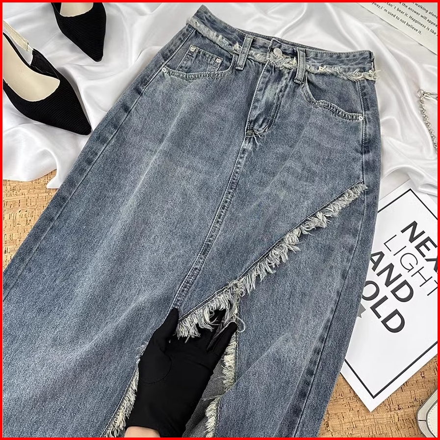 Elegan.girl Rok Jeans Higwaist Belah Samping Korean Style Rok A-line Rok Jeans Wanita Sulaman Highwaist Rok Denim Depan